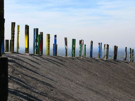Wählt man dann noch den Anstieg auf den höchsten der Wälle ist man ganz oben auf der Halde angekommen. Totem (farbig angemalte Bahnschwellen) zieren hier in einem Halbrund den höchsten Punkt der Halde. Von hier kann man den Blick in die Ferne schweifen lassen und wird feststellen, daß rund um die die Halde Haniel viel Grün zu finden ist.