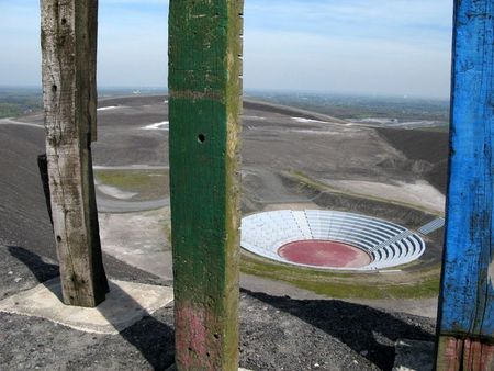Aber das Kreuz ist noch nicht der Höhepunkt der Halde. Wer mutig ist krabbelt den steilen Hang dahinter hoch, wer gut zu Fuß ist nimmt lieber den leichteren Weg über die Rückseite (rechts oder links um den Hügel herum, ca. 10 Minuten Fußweg). Während gerade noch Bäume und Gras um uns herum waren, sind wir jetzt wieder einer Mondlandschaft ausgesetzt. Das schwarze Gold hat seine Spuren hinterlassen. Der Abraum ist zu kleinen und großen Wällen aufgeschüttet, so daß der Blick in die Ferne zu allen Seiten von einem Wall gebremst wird. Mittendrin befindet sich ein kleines Amphitheater, daß zu Ostern u.ä. Anlässen auch gerne als Veranstaltungsort z.B. einer Messe genutzt wird.