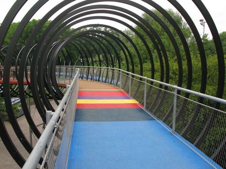Ja klar gibt es auch Kritiker, die sagen „warum baut man eine Brücke unweit einer anderen Brücke“, während andere sagen „es ist keine Brücke, es ist ein Kunstwerk“. Wie dem auch sei, sie ist jedenfalls fertig und eröffnet. Und sie ist schön geworden, schön bunt und irgendwie anders als andere Brücken. Schaumgummiboden, wie man ihn auf Spielplätzen findet, leicht ansteigend, leicht wippend in der Mitte und barrierefrei begeh- und befahrbar. Und wie findet man hin? Entweder man kommt zum Schloß Oberhausen und startet gleich auf der Rückseite zum Brückenabenteuer oder man parkt am Stadion von RWO (Rot Weiß Oberhausen) und läuft von dort aus ca. 5 Minuten zum anderen Ende der Spirale.