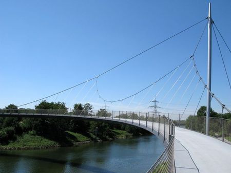 Auf dem Rückweg von der Haldentour bin ich bewußt nicht gleich auf die Autobahn, sondern wollte noch einen Abstecher zum Rhein-Herne-Kanal machen. Nur ein paar Autominuten von den Halden entfernt befindet sich die „Grimberger Sichel“, eine Brücke über den Rhein-Herne-Kanal, Baujahr 2009. Wer schon mal im Gelsenkirchener Zoo (der Zoom Erlebniswelt) war hat die Brücke vielleicht schon mal gesehen. Sie befindet sich außerhalb des Zoo Geländes, aber in unmittelbarer Nähe, gleich auf der Rückseite des Zoogeländes. Die Brücke ist in einer Halbkreisform gebaut (eben in Form einer Sichel) und das besondere, sie hängt nur an einem einzigen Pylon (ich hoffe man nennt das so). Von hieraus startet eine Radtour immer entlang der (ehemaligen) Erzbahntrasse bis zur Jahrhunderthalle in Bochum. Ich bin die Strecke noch nie gefahren (bräuchte auch ein Fahrrad an der Stelle), aber sie soll sehr schön und weitestgehend ebenerdrig sein. Wenn ihr die Strecke kennt hinterlasst doch mal einen Kommentar.