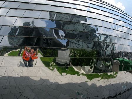 Die beiden Häuser sind unten schmaler gebaut als oben, so daß sich eine Art Überhang ergibt, der von unten wiederum wie ein Spiegel wirkt. Vermutlich haben mich die Menschen im Haus für verrückt gehalten, als ich unter dem Vorsprung lag und Fotos nach oben gemacht habe. Aber das war mir vollkommen egal 🙂 . Auch das Cafe (oder die Bar) auf der Terrasse sieht futuristisch aus. Man könnte meinen, daß ein Ufo dort gelandet ist. Die Front dieses freistehenden Anbaus ist komplett mit einer Art Spiegelkachel versehen, ähnlich wie einer der Gerybauten auf der anderen Hafenseite.
