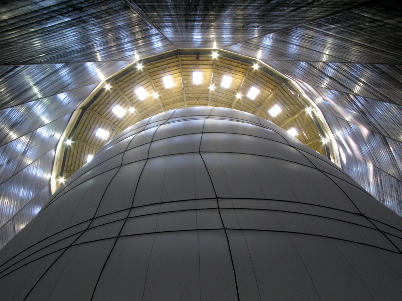 Im Inneren dieser „Halle“ hat Christo nun also eine Skulptur aus 20.350 Quadratmetern lichtdurchlässigem Gewebe und 4.500 Metern Seil fertigen lassen. Die Skulptur wird mit zwei Gebläsen und einem konstanten Luftdruck aufgeblasen wie ein riesiger Ballon. Im aufgeblasenen Zustand erreicht das BigAirPackage ein Gewicht von 5,3 Tonnen, eine Höhe von mehr als 90 Metern, einen Durchmesser von 50 Metern und ein Volumen von 177.000 Kubikmetern. Der Clou man kann den „Ballon“ nicht nur von außen bestaunen (mit dem Aufzug aufs Dach des Gasometers sogar von oben), sondern auch von innen. Eine Drehtüre und ein paar Treppenstufen führt mitten hinein in ein weißes Nichts.