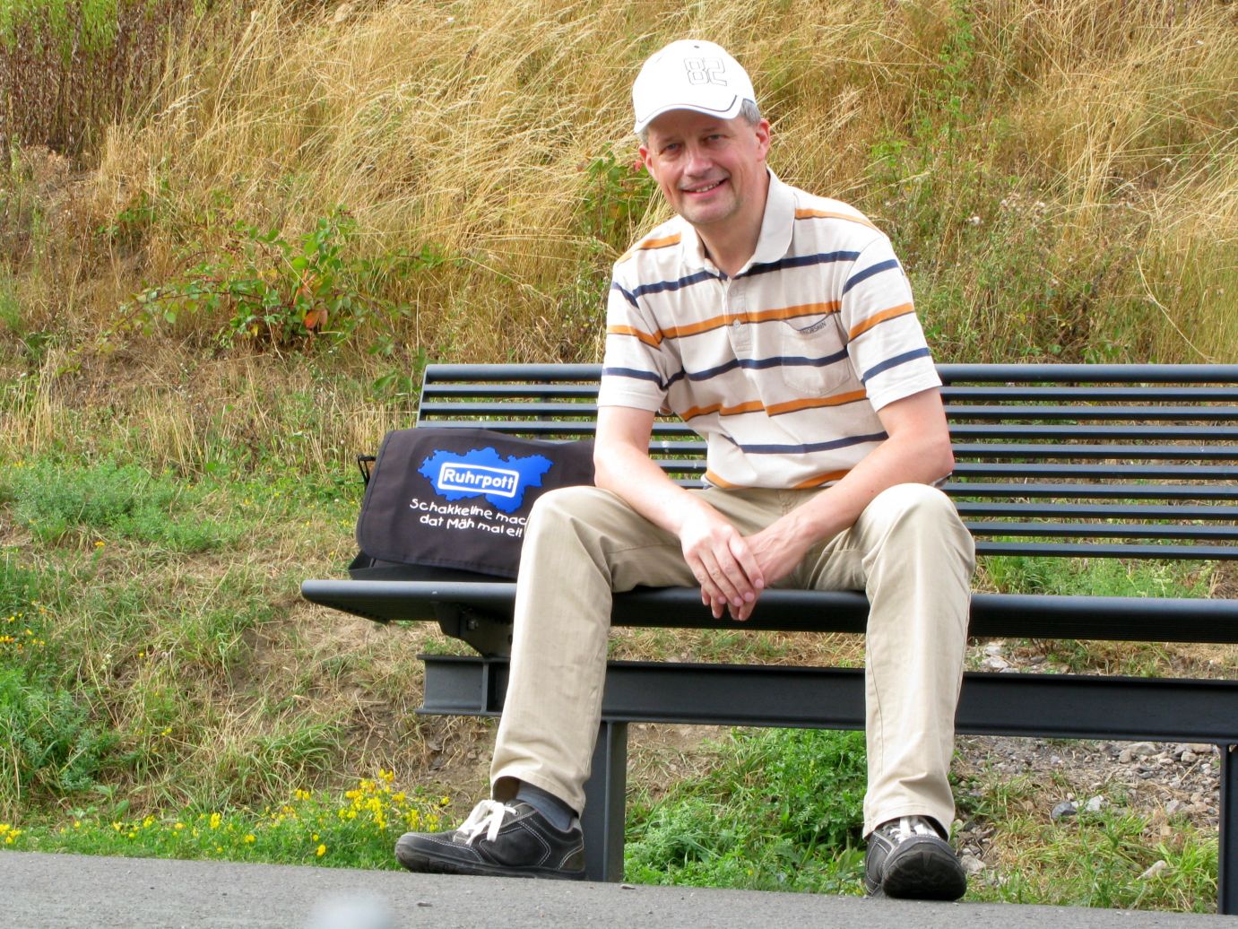 An der Westflanke war’s dafür mächtig windig, so sehr, daß ich mein Cap festgehalten habe (sicher ist sicher) und auch der Kragen des Poloshirts flatterte lustig im Wind. Vor meinen Füßen entdeckte ich ein Stückchen Kohle. Das ist doch Kohle, oder? Vielleicht auch nur ein Stein mit Kohleschicht drumherum, ich hab’s mal mitgenommen, man weiß ja nie was noch kommt.