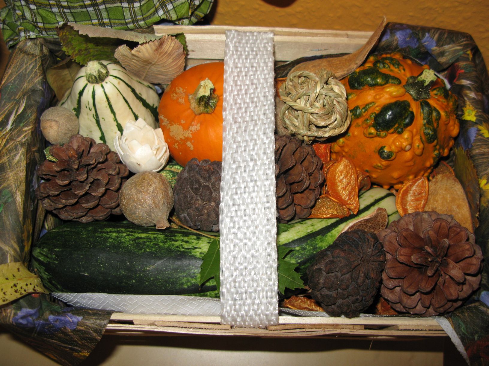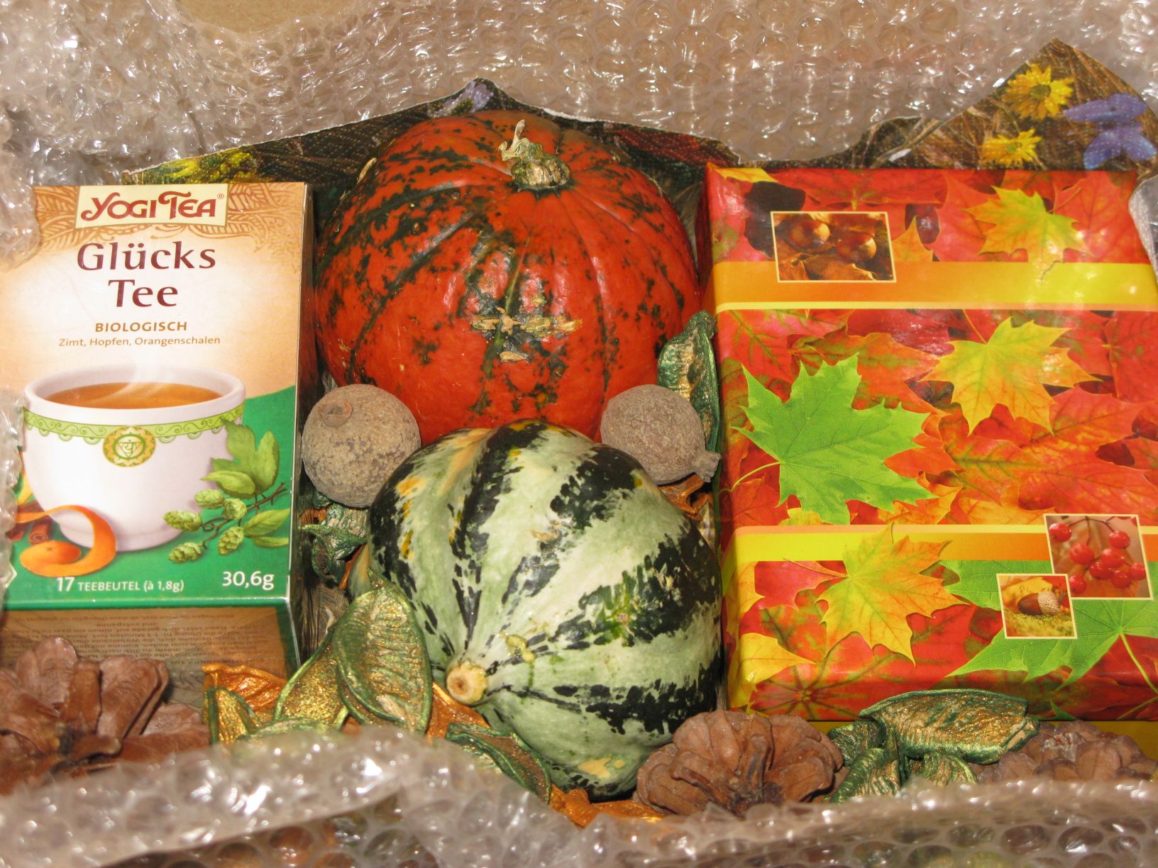 Was, wenn ich jemandem mit dem reichlich gekauften Dekozeug zusätzlich noch eine Freude mache :-D? Also habe ich am Dienstagabend zunächst mein Apfelkörbchen dekoriert und zusammen mit einem fertig gekauften Körbchen und Harry Herbst auf dem kleinen Tisch an der Seite meines Wohnzimmers platziert. Wie erwartet, war noch reichlich Material über. Also habe ich einen leeren amazon Karton ausgelegt mit dieser Knubbelfolie, dazu ein paar Herbstservierten … und das ganze schließlich zu einem Herbstpäckchen zusammengepackt. Dabei habe ich mich amüsiert wie Bolle (man könnte auch sagen ich habe „gegiggelt“), denn mir war klar, daß die Empfängerin dieses Herbstpaketes damit niemals rechnen würde :-D.