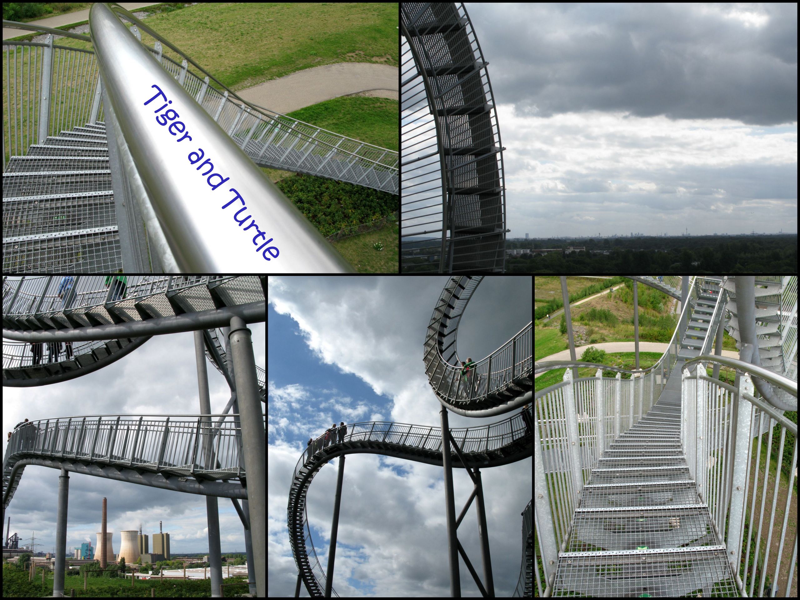 Schließlich habe ich den Sonntag noch, oder wieder mal, auf der höchsten (begehbaren) Achterbahn des Ruhrgebiets verbracht. Die Wolkenberge traten wie so häufig unvermittelt hinter den sieben Bergen mit den sieben Zwergen hervor und verwirbelten den schönen blauen Himmel in ein grollendes Tohuwabohu. Man hatte das Gefühl, die Wolken wollten in der Achterbahn rückwärts fahren … Ihr meint das wäre etwas übertrieben? Na gut, aber der Himmel wurde wirklich dunkler und ich habe mich erstmal über die Currywurst aus dem kleinen roten Wägelchen unterhalb der Achterbahn hergemacht. Übrigens wärmstens zu empfehlen :-).