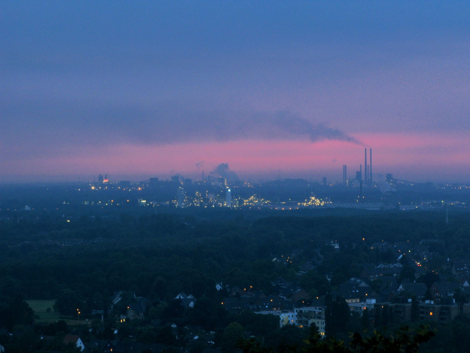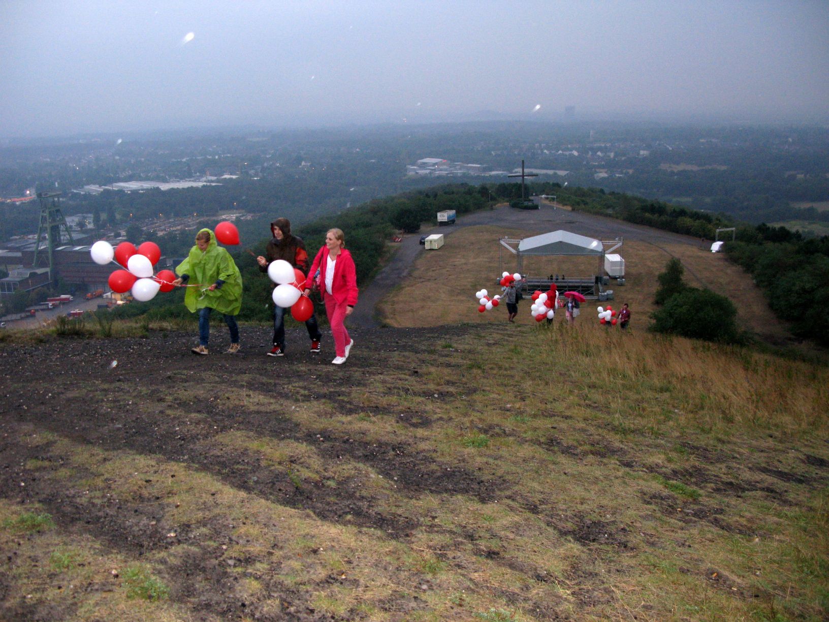 Nachdem auch die letzten eingetroffen sind, setzt sich die Karawane in Bewegung und sorgt bei der zufällig vorbeikommenden Bevölkerung für Aufmerksamkeit. Kein Wunder, schließlich sind es um die 200 Ballons. Es ist gegen 18.45 Uhr als viele die Halde verlassen während wir erst kommen. Ob das ein Zeichen sein sollte? Wir ignorieren die Zeichen einfach und tapern munter drauflos. Man braucht ca. 25-30 Minuten, bis man oben auf der Halde Haniel angekommen ist. Nach 10 Minuten fallen die ersten Tropfen. Zucker? Ach was, ich hab’ ja die Regenjacke an.