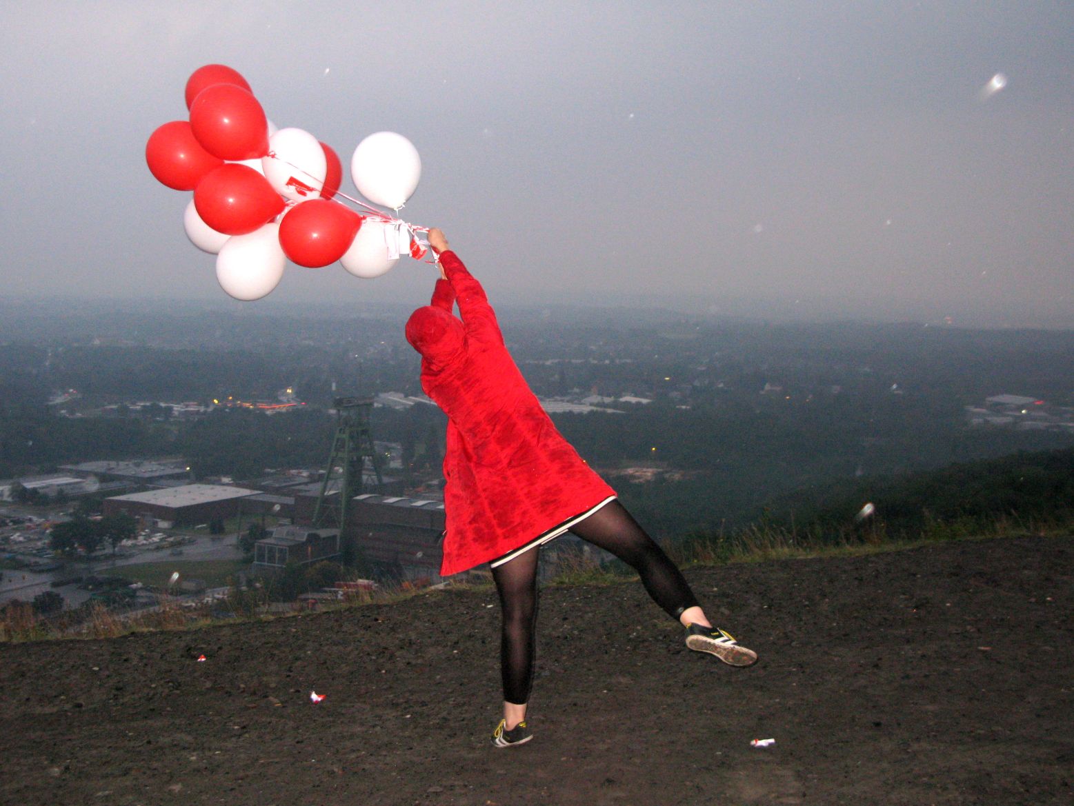 Treffen ist gegen 18.00 Uhr an der Halde Haniel, ich bin etwas früher da und es ist trocken. Was die Wetterleute da immer erzählen :-D. Als ich um die Ecke biege steht dort Julis Auto mit Unmengen von roten und weißen Ballons. Alle mit Gas gefüllt und gut verknotet. Gelegenheit einige “Facebookfreunde” mal persönlich kennenzulernen. Die Fotosession startet, Juli wird von vorbeifahrenden Radfahrern kurzerhand zum Model erhoben, kein Wunder bei dem Auflauf an (Hobby-)Fotografen :-D. Die Ballons werden schließlich mit kleinen Kärtchen versehen und sollten gleichmäßig verteilt werden. Was keiner bedacht hat, ist daß sich die Schnüre alle miteinander verknoten, so daß sich eine Riesen Traube bildet. Die Zeit drängt, es dämmert schon leicht.