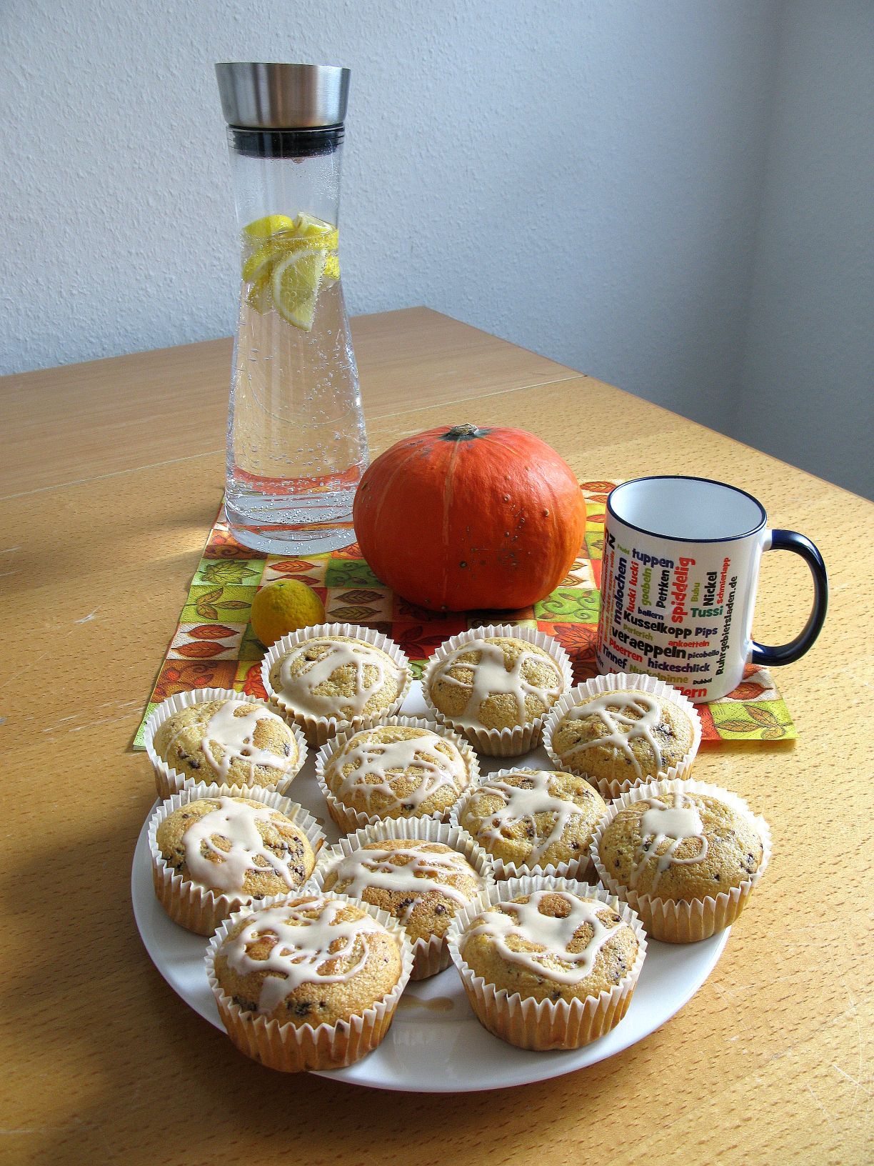 Puh die Arbeitswoche war, obwohl nur 4 Tage lang, mächtig anstrengend. Aber heute ist endlich ein bisschen Zeit, um auch mal in der Küche rumzuwirbeln. Ihr wißt ich bin Profi in … na ja und vielleicht auch … aber nicht im Kochen. Aber während der Frühstückskaffee noch auf dem Tisch steht, habe ich mir für den Nachmittag ein paar Muffins gebacken und mit Mandelgasur verfeinert. Dazu ein leckeres Zitronenwasser aus der nagelneuen Glaskaraffe. Und im Hintergrund steht immer noch der Herbstkürbis. Daraus sollte sich doch auch etwas machen lassen ;-).