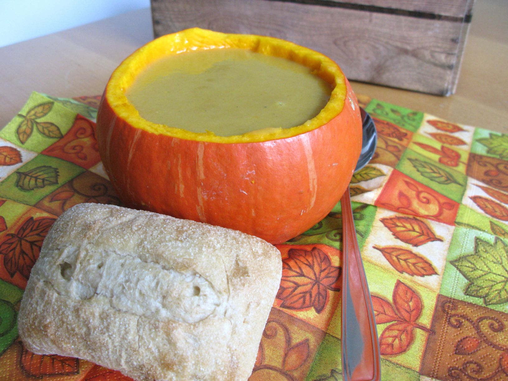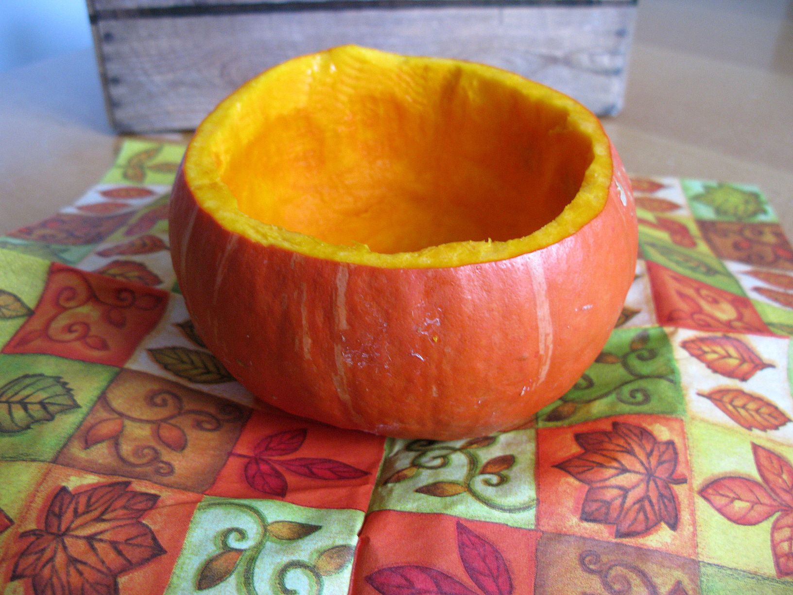 Das folgende kann sogar jemand, der zwei linke Hände hat. Das Rezept ist sicherlich etwas ungewöhnlich, denn für die Zubereitung (und die Fotos) benötigt ihr einen tiefen und einen flachen Teller, einen Desserteller, einen Karton, der aussieht als wäre er eine Holzkiste (für den Fotohintergrund), eine Suppenkelle, einen weiteren Löffel, eine Mikrowelle und eine Dose. Den Inhalt der Dose (Kürbis-Kartoffel-Suppe aus dem Hause Quadriga oder jedem anderen Hersteller) schüttet ihr in den tiefen Teller, stellt diesen auf den flachen Teller und beides für 3 Minuten in die Mikrowelle. Unterdessen entsorgt ihr den Kerne-Fruchtfleisch-Matsch aus dem Kürbis im nächsten Mülleimer. Ihr dekoriert den Dessertteller mit einer Serviette, stellt den Kürbis drauf und nach 3 Minuten schaufelt ihr die lecker duftende Suppe aus dem tiefen Teller in den ausgehöhlten Kürbis, legt noch das Brötchen, welches vom Frühstück übrig war, als Suppendeko daneben und genießt die Suppe. Guten Appetit :-D.