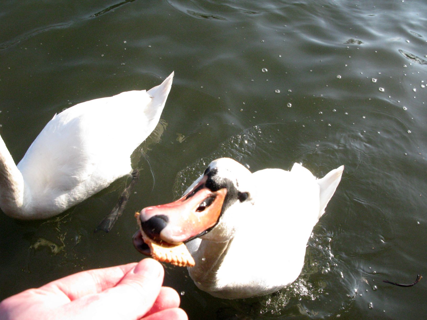 Nach ein paar Fotos an der Brücke, die an diesem Mittag relativ leer ist, kommt ein Schwanenpaar auf mich zugeschwommen. Also die Kekse ausgepackt und zum Schwanenpicknick niedergelassen. Eine(r) der beiden war sogar mutig genug, die Kekshälften aus der Hand zu nehmen. Nun ist es etwas schwierig, gleichzeitig zu füttern, sich nicht in die Finger picken zu lassen und dazu noch ein paar Fotos zu schießen, aber ich hatte ja Zeit (ein seltenes Gut in letzter Zeit). Wie schon gesagt, so ein Tag Auszeit mitten in der Woche, daran könnte man sich gewöhnen 😉 .