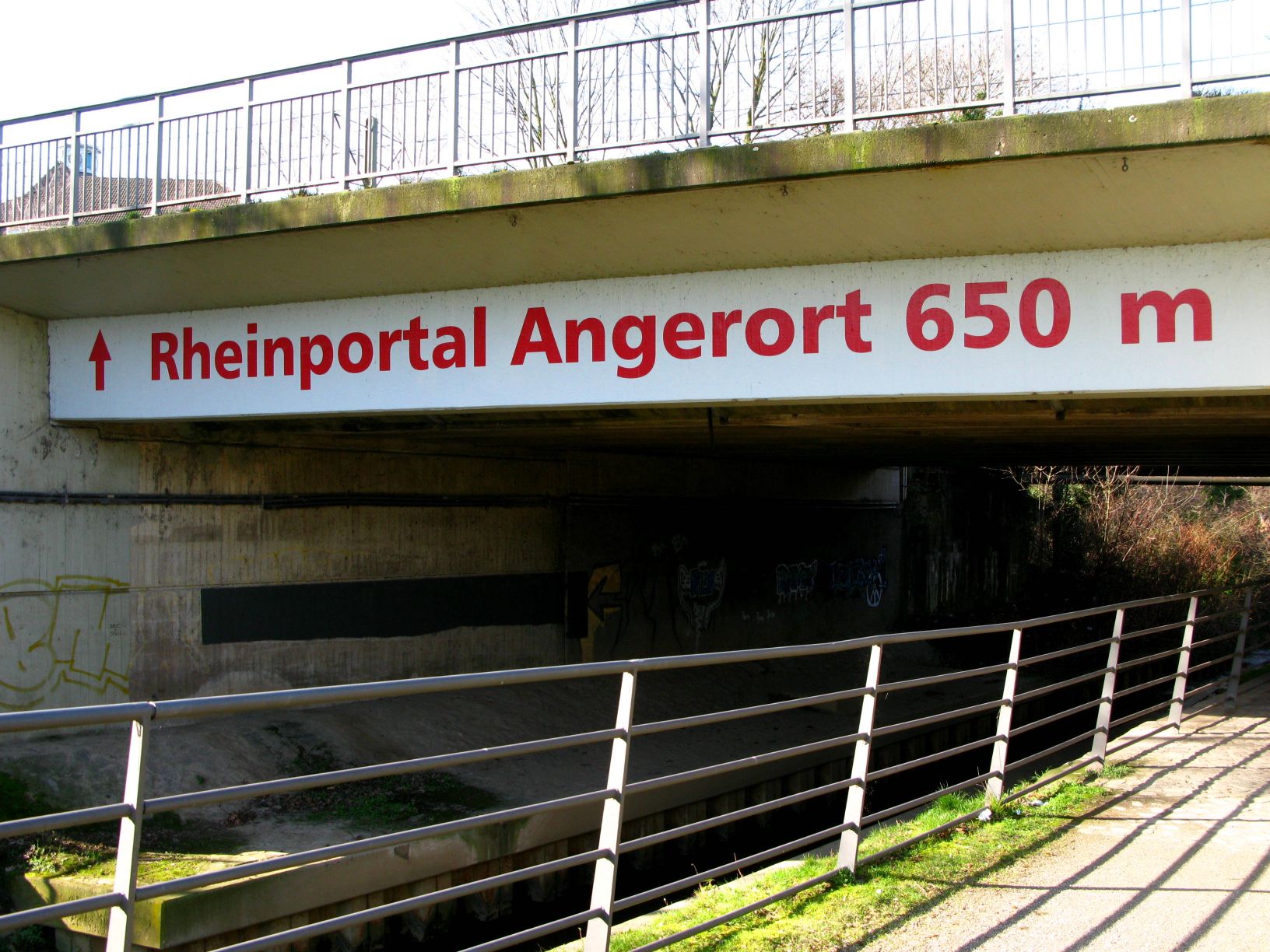 Und das könnt ihr auch tun, denn der befestigte Weg führt durch einen Tunnel unter der Straße und unter den Eisenbahnschienen hindurch in wenigen Minuten zur Mündung des Angerbachs in den Rhein. Dank ausreichender Beschilderung (gut versteckt unterhalb der Brücke) ist der Weg ja nicht zu verfehlen 🙂 . Gut ein Weltereignis erwartet einen hier nicht, aber der Aussichtsstieg neben dem historischen Haus Angerort bietet mehr, als ich in dem Industriefleckchen erwartet hätte. Und er ist Hochwassersicher, eher läuft der Angerbach über.