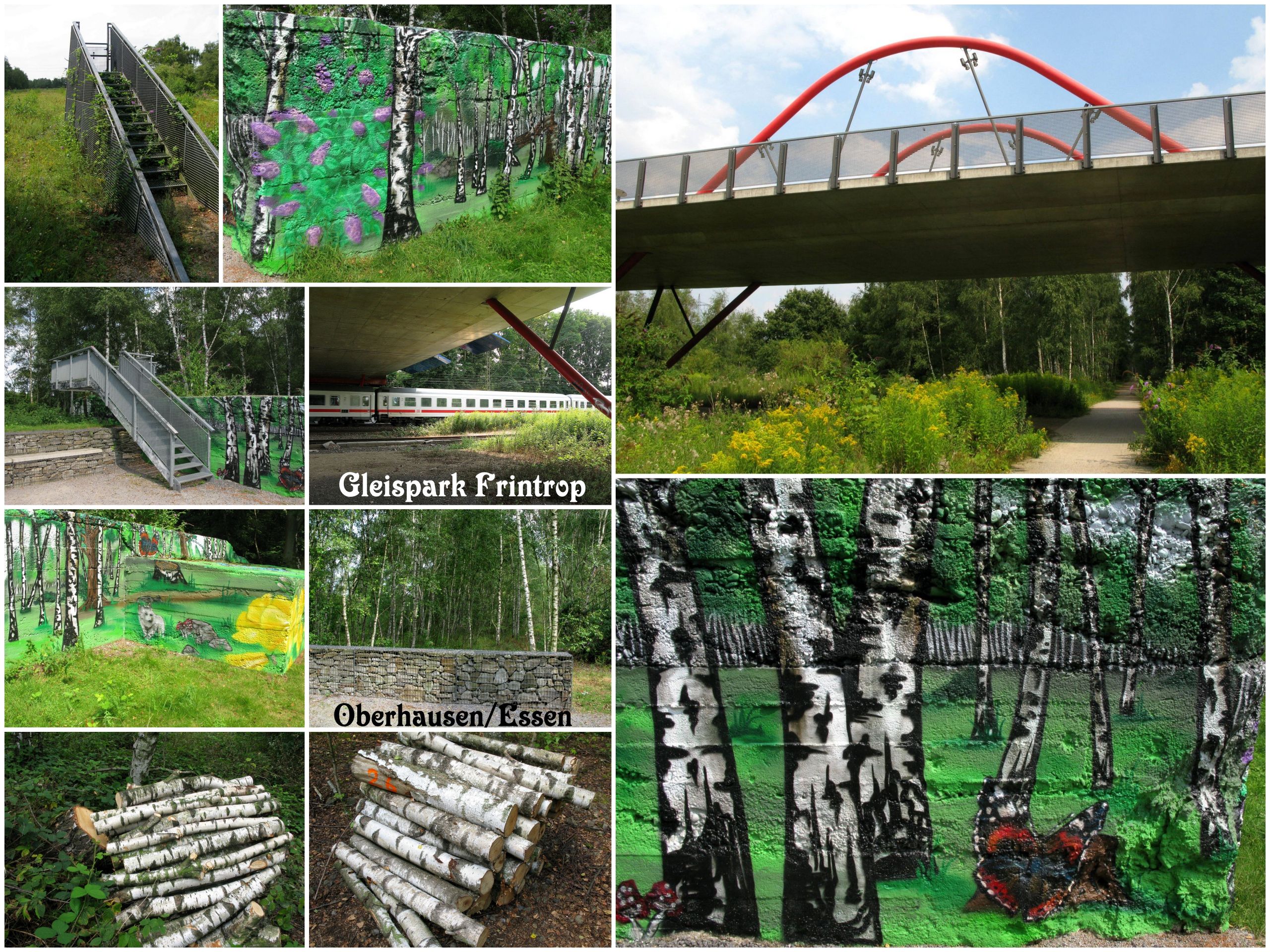 So war ich letzte Woche also mal wieder in Oberhausen, habe einen Abstecher zur Zeche Sterkrade gemacht, an der ich noch nie war und habe mich (nochmal) im Gleispark Frintrop (Nähe Haus Ripshorst) umgesehen. Kinners ich sachet euch, da findet ihr Aussichtsplateaus, da weiß auch nur der Erbauer, was man da sehen soll. Bei ein Plateau gibbet nix zu sehen außer Wiese, das zweite geht immerhin zwischen die Bäume innen Wald um ausnahmsweise da mal nix zu sehen und dat dritte, dat ist richtig interessant, denn unten isset bunt bemalt und man kann vor ein paar Bäume gucken. Zwischendrin gibbet dann noch mal hier und da ne Mauer im Wald, auf die du noch nichtmal’n Bier oder so abstellen kannst und in den Wald drin, da liegen jede Menge nummerierte Birkenstämme, also kleine Stücke davon. Ich nehme mal an, dat se hier noch am Bauen dabei sind, so eine Art Birke von Ikea. Also der Gleispark ist schon Klasse. Gleise? Ja die gibbet auch, aber da rauschen einem die Güter- und Regionalzüge über die Füße, da sollteste mal schnell von weg bleiben.