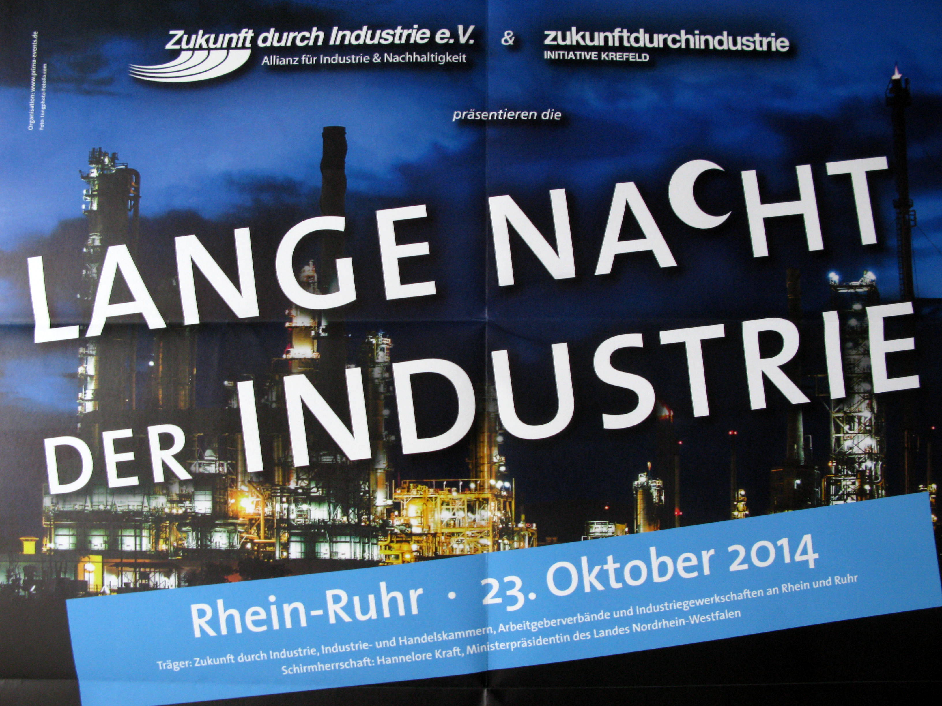 Was der Maus Türöffnertag für die Kinder ist, zeigt die „Lange Nacht der Industrie“ für Erwachsene. Klingt verrückt, ist aber so :-). Wann seid ihr in eurer Nachbarschaft oder eurer Stadt schon mal auf die Suche nach Industriebetrieben gegangen? Wißt ihr, was in eurer Stadt hergestellt wird? Seht ihr, ich auch nicht? Bei der Langen Nacht der Industrie, die dieses Jahr zum vierten Mal stattfand, kann man hinter die Kulissen gucken, vorausgesetzt man hat das Glück einen der begehrten und schnell ausgebuchten Plätze zu bekommen. Treffpunkt war am Donnerstag gegen 17.00 Uhr der Sprödentalplatz in Krefeld, auf dem die Busse auf die Gäste warteten. Natürlich findet die Lange Nacht der Industrie einmal im Jahr auch in anderen Teilen der Republik statt, aber ich wollte mich ja in Krefeld umgucken. Entschieden hatte ich mich für eine bestimmte Tour und als angemeldeter Blogger gab’s zusätzlich zu den reichlichen Infobroschüren und Sicherheitsanweisungen noch eine Infomappe oben drauf. Unser Tour Guide wies uns nochmal auf die Regeln (Fotografierverbot und Nichtraucherflug … äh .. -fahrt) hin und dann ging’s los :-).