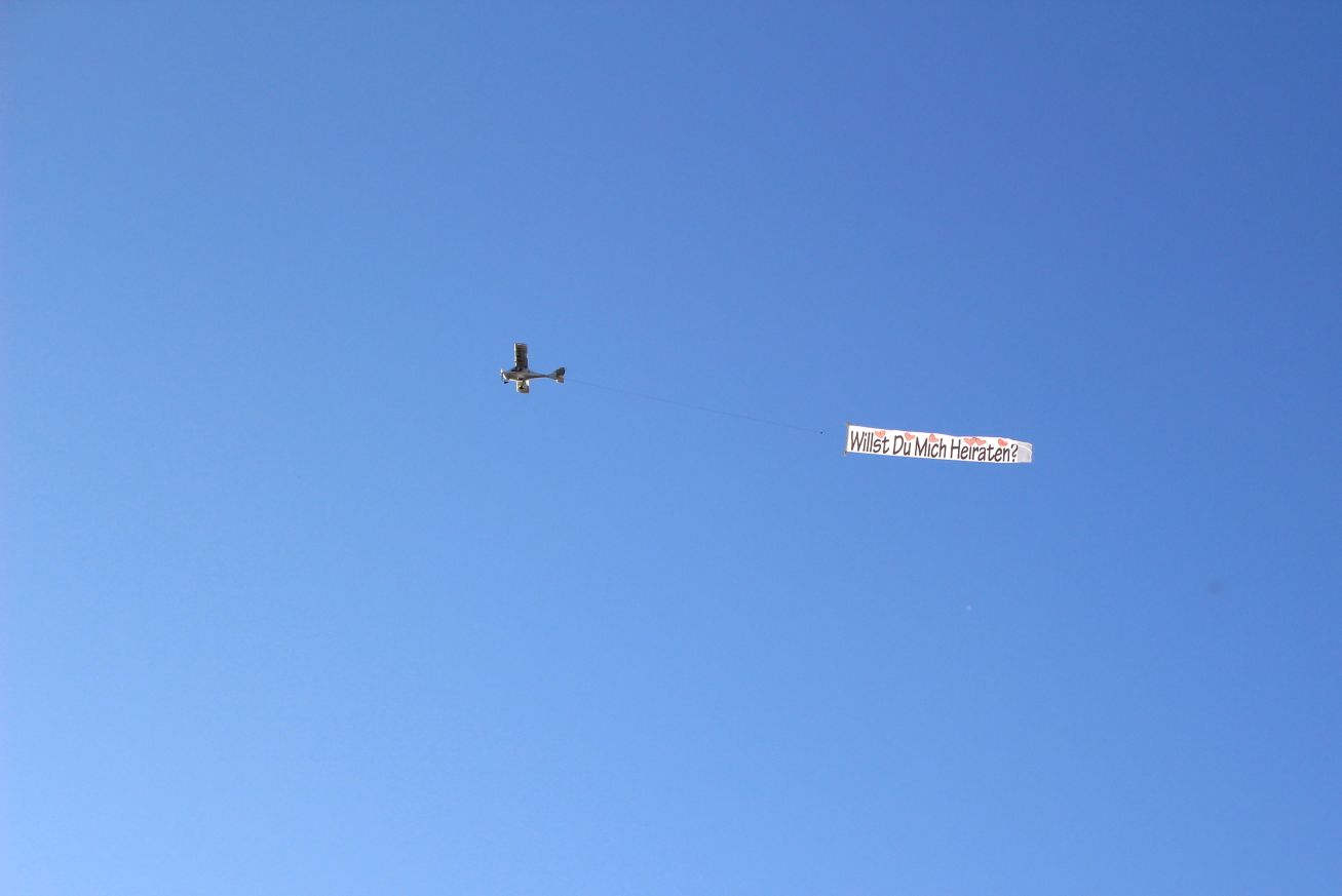 Als ich bereits den Rückweg eingeschlagen hatte kam ein kleines Sportflugzeug mit einer riesigen Schleppe hinten dran. Aufschrift „Willst Du Mich Heiraten?“ … nein nicht ich, aber ich habe meine Kamera kurz hoch, einen Schnappschuß gemacht und bei Facebook veröffentlicht. Am selben Abend meldete sich noch der Pilot und vermeldete ein erfolgreiches Ende für den Auftraggeber und zeigte umgekehrt Luftaufnahmen. Auf dem ersten war ich eindeutig (ha ha natürlich nicht 😀 ) zu sehen. Schon verrückt, auf welche Weise man via Internet zusammenkommt.