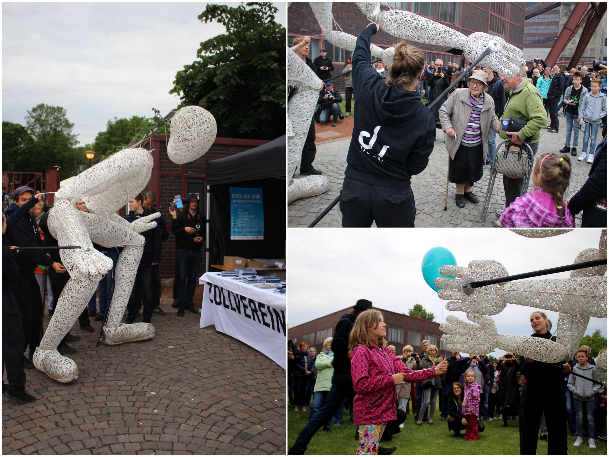 Das Ziel Essen doch erreichend, hatte ich mir vorgenommen dieses Jahr unbedingt Dundu kennen zu lernen und das G.O.P Varietetheater zu sehen. Das G.O.P zeigte neben fliegenden Tischchen einen fingerfertigen Spielkartenspieler, eine junge Dame an der Vertikalstange und einen atemberaubenden Balance Act. Keine Frage sehr kurzweilig. Danach schnell zurück in den Ehrenhof der Zeche Zollverein, denn dort kündigte sich Dundu an. Dundu ist eine 5 Meter große, voll bespielbare Großfigur des Puppenspielers Tobias Husemann.
