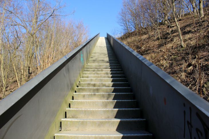 Mit dabei die Halde Norddeutschland (Neukirchen Vluyn), die Knappenhalde (Oberhausen, gegenüber vom Centro), die Heinrich-Hildebrand-Höhe (begehbare Achterbahn im Duisburger Angerpark) und die Halde Haniel (Stadtgrenze Oberhausen/Bottrop). Die Himmelsleiter an der Halde Norddeutschland wird bekanntlich gerne von Sportlern genutzt, die dort auf und ab joggen, während ich nach Luft schnappend auf der ersten Hälfte pausieren muß. Es dürfte irgendwann Mitte Januar gewesen sein, wenige Grad über Null, als mir der erste Sportler in kurzer Hose und T-Shirt über den Weg lief. Ich kam mir mit Jacke, Schal und Mütze vorübergehend etwas overdressed vor 😉 .