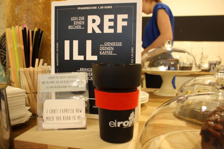 Hamburg ist eine der ersten mir bekannten Städte, die ein Coffe to go Bechersystem mit Pfand unter dem Namen „Refill it“ anbietet. Ihr kauft einen Deckel mit Mundstück, eine Manschette gegen zu heiße Finger und leiht einen Becher gegen 1,50 € Pfand. Die teilnehmenden Cafés und Bäckereien geben die Becher aus, nehmen sie aber auch wieder zurück, spülen sie und geben sie wieder aus. Die Becher werden zu 100 % aus nachwachsenden Rohstoffen hergestellt und sind, lt. Homepage, zu 100% biologisch abbaubar. Leider machen z.Zt. nur eine begrenzte Anzahl Anbieter bei diesem System mit, aber ich habe mir das System bei „Herrn Max, einem netten kleinen Cafe im Schanzenviertel angesehen. Die Becher fühlten sich fest an, erstaunlich für ein recycelingfähiges Material. Daß ich ausgerechnet „Herrn Max“ ausgesucht habe lag irgendwie nahe, denn ich bin schließlich Herr Marx(!) 😉 .