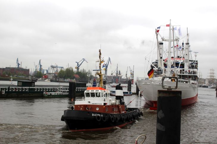 Der letzte Tag stand schon wieder vor der Türe und gleichzeitig Start des Hamburger Hafengeburtstags. Ich war nach dem Frühstück und dem Auschecken aus dem Hotel nochmal im Hafen und wollte dabei sein, wenn die Cap San Diego, sonst ein Museumsschiff, an diesem Morgen ausläuft. Zwei Schlepper zogen die alte Dame Baujahr 1960/61 aus ihrem Liegeplatz, bevor dunkle Wolken aus dem Kamin quollen und die eigene Schiffsschraube ihren Dienst versah. Während ich via Überseebrücke in den Niederhafen spaziere, um noch ein paar Schiffe abzulichten setzt auch an diesem Morgen der Regen wieder ein und stoppt vor meiner Abreise nicht mehr. Da machste nichts, Schietwetter eben.