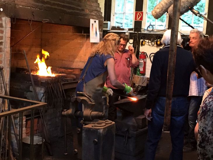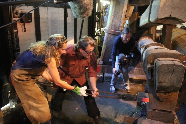 Mit jedem herunterdonnern des Hammers wird ein Stück heißes Eisen geschmiedet und jeder Schlag läßt den Boden förmlich erbeben. Während also der Hammer kurz auf seine Funktion getestet wurde, kommt das Kamerateam mit 2 Kameras und zwei Tonleuten in die Scheune und kurz darauf steht Tamina Kallert neben mir. Sie ist dieses Mal, wie ich bereits einen Tag vorher via Facebook erfahren habe, mit einem Hausboot (mit Pedalantrieb) auf der Ruhr unterwegs. Wie sie mir sagt, geht es dieses Mal zu Ausflugszielen rund um die Ruhr. Ihr solltet also im Frühjahr 2018 im WDR Programm mal Ausschau halten.