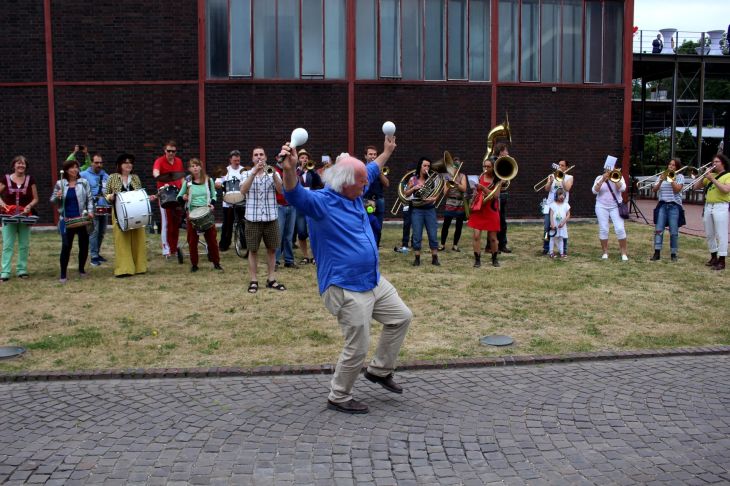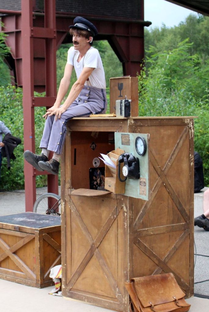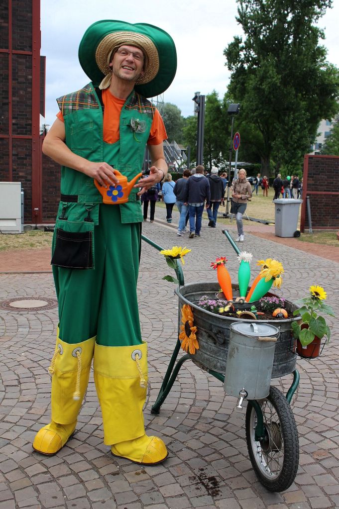 Auf dem Weg nach draußen begenet mir (passend zur Grünen Hauptstadt) Imanuel Immergrün, der ca. 2,50 Meter große Gärtner. Er jongliert mit Keulen, vermutlich sind es die berühmten Jonglagemöhren oder ist sogar ein Rettich dabei? Man weiß es nicht 😉 . Auf dem Vorplatz vor dem Ruhrmuseum steht die nächste Traube an Menschen. Jean Philippe Kikolas, ein spanischer Slapstik Künstler, versteht es sein Puplikum ohne Worte mit ins Geschehen einzubinden. Ein kleines Mädchen soll ihm beispielsweise einen Jonglierball wiederbringen. Als der Künstler sich bedanken will ist das Mädchen schon wieder weg, als es wiederkommt ist der Künstler abgelenkt, als er sich doch bedanken will ist das Mädchen wieder weg. So geht das 2 Min. bis die beiden zusammenkommen 😀 .