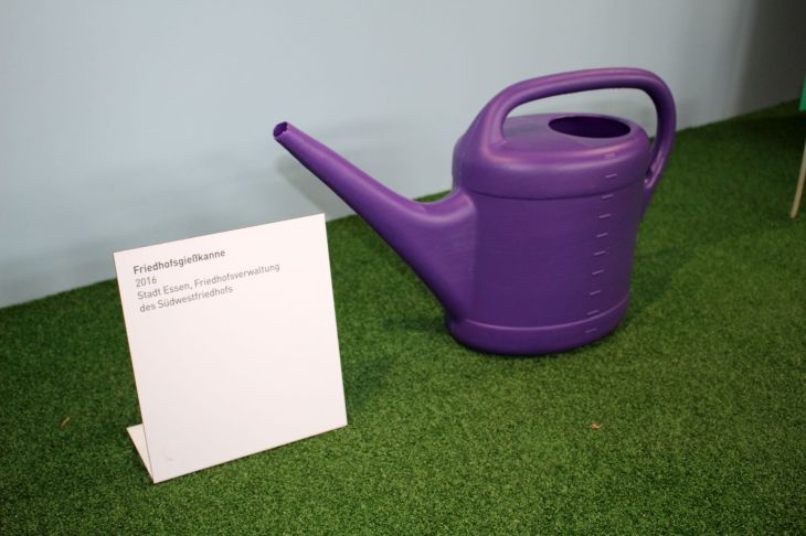 Nach soviel Action besuche ich die momentan auf Zeche Zollverein stattfindende Ausstellung der Grünen Hauptstadt Europas „Grün in der Stadt Essen – Mehr als Parks und Gärten“ in Halle 5. Eine bunte Mischung aus Fotos, Skulpturen, Tieren und Plakaten aus und über die Geschichte Essens erwarten den Besucher. Sogar der Baumstupf eines Baums, der im Schellenberger Wald vom Sturm Ela abgeknickt wurde, ist dabei. Ich gebe zu, nicht jedes Ausstellungsstück habe ich mir im Detail angeguckt, sehenswert fand ich die lila Gießkanne vom Essener Südwestfriedhof aus dem Jahr 2016 😀 . Ihr glaubt ich scherze? Schaut selber, die Ausstellung läuft noch bis zum 27.08.2017 in Halle 5 und der Eintritt erfolgt nach eigenem Ermessen [Pay what you want].