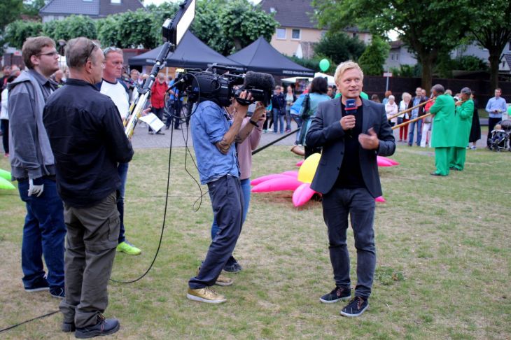 Während dessen rückt der Uhrzeiger auf 19.30 Uhr vor, Zeit nochmal auf den Ehrenhof zu wechseln, denn von dort meldet sich der WDR mit der Samstagsausgabe der Lokalzeit (Extra). Mal zusehen, wie Marc Schulte die Sendung moderiert. Erstaunlicherweise stehen hier kaum Menschen um den Moderator, vermutlich weil es soviel zu sehen gibt, daß eine Kamera und ein Mikrofon mehr oder weniger kaum auffallen. Ich wechsle in den Zollvereinpark weiter hinten auf dem Gelände, als der Regentanz vom frühen Abend Wirkung zeigt, denn es fängt an zu nieseln.