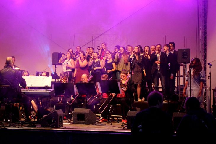 Auf der Außenbühne im Landschaftspark sang gearde ein Mädchenchor mit kräftiger Stimme, so daß ich auch hier einen Moment stehen blieb. Dann trieb es mich zurück, einen Platz für’s Feuerwerk sichern und meinen Regenschirm wieder mal einsetzen, denn je näher der 23.00 Uhr Termin rückte, je feuchter wurde es wieder. Aber fotografieren und Schirm halten harmoniert nicht miteinander, also ab unter einen kleinen Baum.