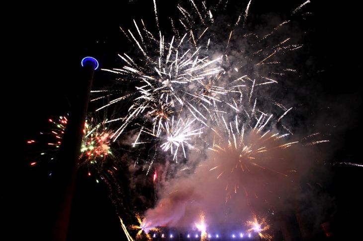 Als erstes mache ich mich auf die Suche nach TV Kameras, die später das Feuerwerk übertragen und werde auch schnell fündig. Vor der ehemaligen Kraftzentrale gibt es ausreichend Platz für Kameras und Zuschauer. Bis zum Feuerwerk um 23.00 Uhr ist noch etwas Zeit, also drehe ich noch eine Runde durch den Park und mache einen Abstecher in die Kraftzentrale, in der sogar überraschend gute Musik läuft. Eine Band namens BK&S (BK&S – Broekhuis, Keller & Schönwälder) spielte dort auf Synthesizern und soweit ich das erkennen konnte, mit Hilfe von Laserstrahlen die Laserharfe.