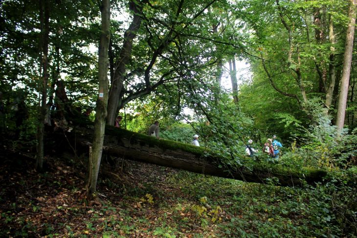 Während ich aber seinerzeit den bequemen Weg eingeschlagen habe, geht der Baldeneysteig zum Teil ausgefallene Wege, schließlich ist es ein Wandersteig und kein Wanderweg. Geschätzt ca. 80 weitere z.T. singende Wandergäste jeder Altersklasse (incl. dreier Nonnen, dem Oberbürgermeister und der Presse) waren dabei, den 6 km langen Weg zwischen Essen Werden und dem Haus Scheppen zu erkunden. Immer dem Wanderzeichen nach, das sich grafisch und farblich am Logo der Grünen Hauptstadt orientiert.