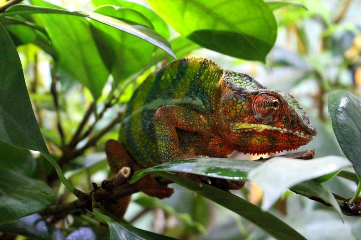 Besonders lange stehe ich wieder bei meinen beiden Liebingstieren dem Chamäleon und dem Madagaskar-Taggecko, der sogar an der Decke laufen kann und so grün ist, daß er im Blattwerk manchmal fast verschwindet. Dazwischen wuseln ein paar Grillen und die eine oder andere kleine Heuschrecke und zack hat sich das Chamäleon wieder gezielt eine davon mit seiner langen Zunge gefangen.