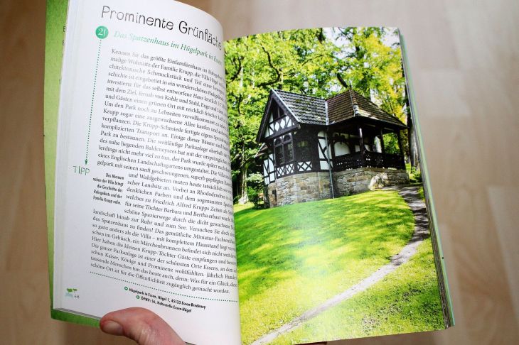Jetzt bin ich aber neugierig und blätterte gleich durch die ersten Seiten. Den Westpark in Bochum, den Gehölzgarten Ripshorst in Oberhausen und den Nordsternpark in Gelsenkirchen kenne ich. Also nur ein weiterer Reiseführer über das Ruhrgebiet? Nein, das würde diesem Buch vermutlich nicht gerecht werden. Es geht nicht darum, das zu zeigen, was alle anderen Reiseführer auch zeigen, es geht eben um die 80 „grünen“ Orte. Jeder liest sich wie ein kleiner Blogbeitrag, kurz und knapp auf das Wichtigste beschränkt, dazu eine Adresse und die Anreisemöglichkeit, für alle, die einen Glücksort selber erleben möchten.