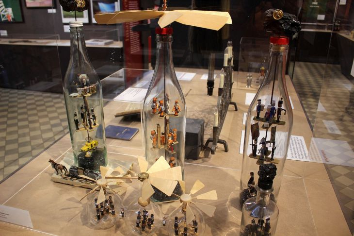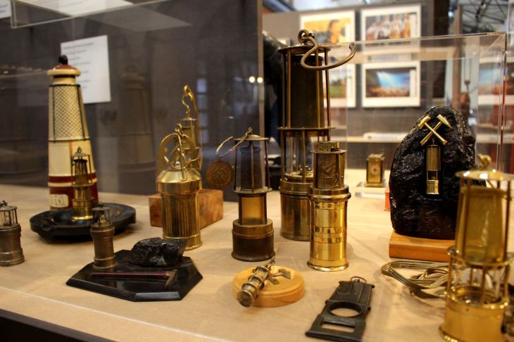 Die Jahrzehnte lange Tradition des Ruhrgebiets ist mir erst mit dem Kulturhauptstadtjahr so richtig bewußt geworden. Der Ruhrpott ist mittlerweile längst nicht mehr grau, auch wenn sich der Mythos nach wie vor hält, aber nicht umsonst, ist die Bergbaugeschichte verbunden mit dem Begriff Maloche. Beim Betreten der im übrigen kostenlosen Ausstellung, fällt der erste Blick auf die für den Bergbau typischen Grubenlampen sowie auf die heilige Barbara, die Schutzpatronin der Bergleute. Und was sind das für Flaschen? Wer bisher dachte nur Schiffe kommen in die Flasche, erkennt im nächsten Schaukasten auch Bergleute können in einer Flasche verewigt werden.