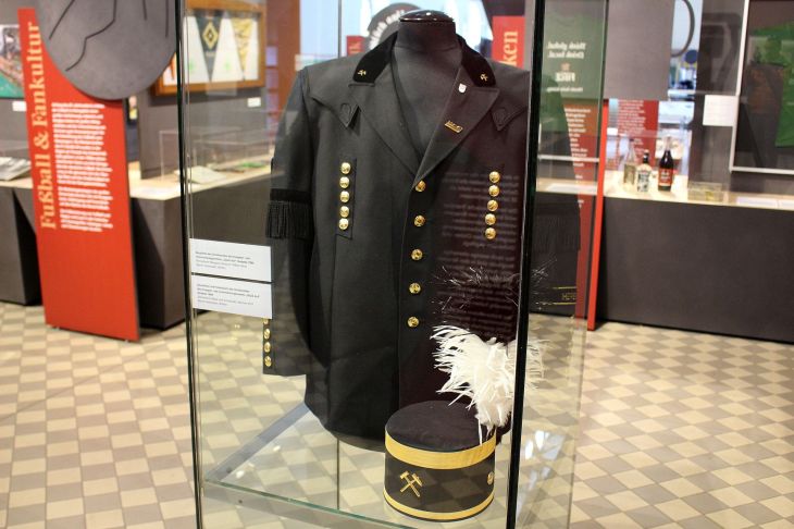 Die Tradition der sogenannten Geduldsflaschen, bei denen der Zusammenbau in der Flasche stattfindet, ist schon mehr als 300 Jahre alt und kam aus dem Erzgebirge ins Revier. Auch davon hatte ich noch nie gehört. Etwas bekannter dürfte die traditionelle Tracht der Berg- und Hüttenleute sein. Sie besteht noch heute aus Bergkittel und Schachthut. Beides findet sich im nächsten Schaukasten. Wußtet ihr, daß auch der Fußball im Revier aus dem Arbeiter- und Bergmannsmileu entstanden ist? Die Ausstellung zeigt typische Fanbekundungen von der Kutte bis zur Trommel.