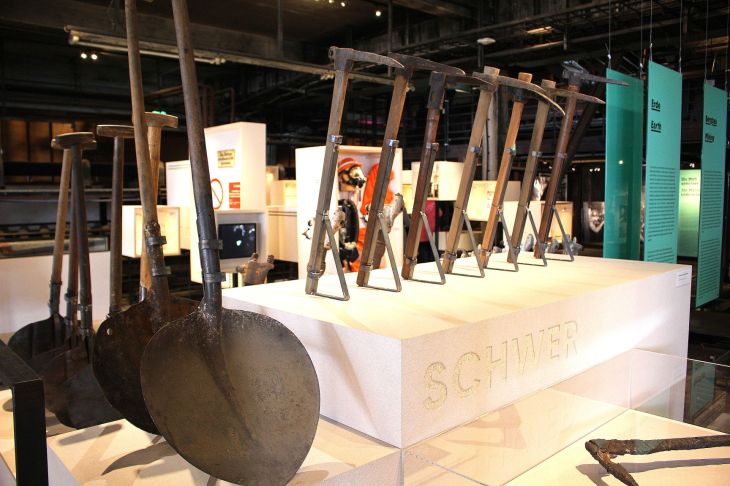 Die Kohle gelangte von hier oben früher auf die Verteilerebene, ich hingegen gehe die Treppe herunter. Natürlich ist das Ruhrgebiet nicht die einzige Kohleregion und das wird als nächstes an Hand der Kohlevorkommen außerhalb Europas, in den USA, Australien usw. gezeigt. Jede Region ist mit einem Stück Kohle vertreten. Wiederum eine Treppe tiefer befinden sich die Werkzeuge, mit denen Arbeiter früher an die Kohle gelangten. Helme, Schutzanzüge, Pickhacken, Lampen begleitet von Fotos, welche die Arbeit im Bergbau dokumentieren.
