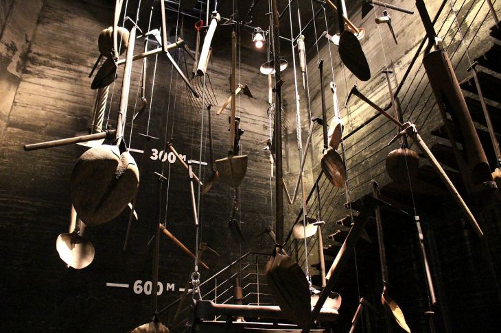 In der Ausstellung gibt es dann einen kritischen Blick auf die beiden Weltkriege, denn auch TNT, Flugbenzin und Gummireifen wurden aus den Steinkohlenteer hergestellt. Inmitten des Trichters der Mischanlage, dem einzigen Raum, der nicht betretbar ist, schwebt frei und glitzernd der „Dark Star“, eine für diese Schau gefertigte Installation aus Fiberglas und Kohlenstaub des Künstlers Jonathan Anderson. Zurück im Treppenhaus geht es für den Besucher auf der Trichterebene schließlich um die Nachkriegszeit, Wiederaufbau und Folgen des Kohlezeitalters bis hin zu den aus dem Kulturhauptstadtjahr bekannten Schachtzeichen.