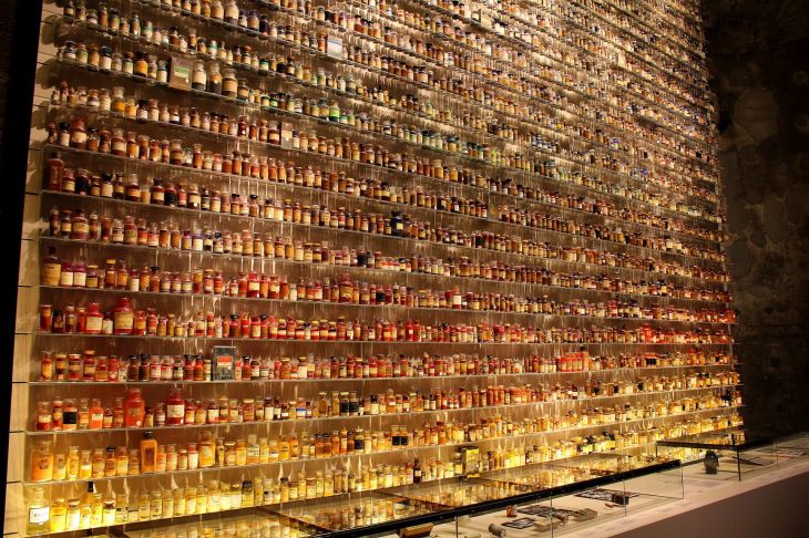 Eine Etage tiefer geht es um die Nebenprodukte der Kohle (z.B. Steinkohlenteer) die beim verkoken von Kohle in der Kokerei entstehen. Das Kohlegas z.B. wurde wiederverwendet, um künstliches Licht zu erzeugen. So hängen 27 Gasstraßenleuchten (aus den Jahren 1880 – 1930) von der Decke eines Ausstellungsraumes und als Krönung finden sich eine Wand weiter 3.000 historische Glasfläschchen mit Teerfarbstoffen im Regal. Jeder der früher mal einen Kaufmannsladen im Kinderzimmer hatte dürfte hier neidisch werden.
