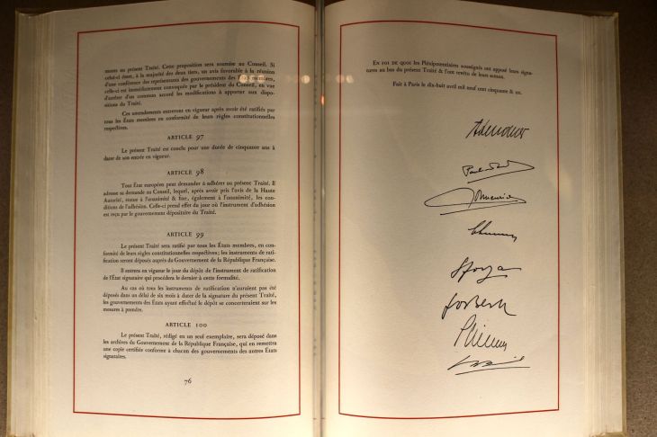 Hier liegt auch der nicht öffentlich einsehbare Gründungsvertrag der Europäischen Gemeinschaft für Kohle und Stahl (EGKS) in einem Schaukasten. Der Gründungsvertrag enthält die Unterschriften der Außenminister von 1951, darunter die von Konrad Adenauer, der seinerzeit auch Außenminister war. Eines der leuchtend gelben Schachtzeichen aus dem Jahr 2010 wurde schließlich in einem Trichter nachgestellt.
