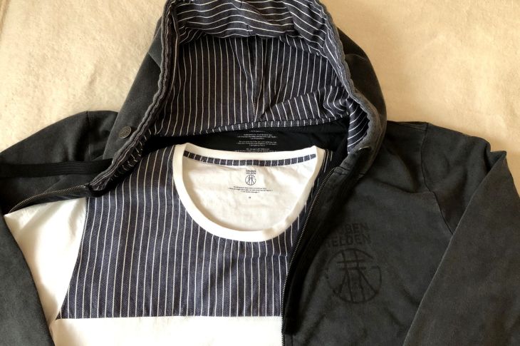 Der „Zip-Up Hoodie“ mit dem Grubentuchmuster in der Kapuze und das T-Shirt ist ein „Consol“.