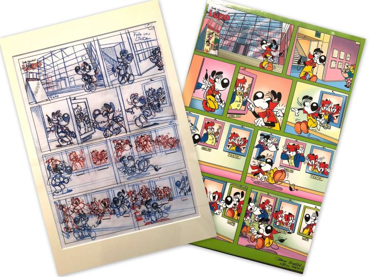 Noch stärker fällt der Wandel bei Lupo aus, der anfangs als böser Isegrim, dann als Lubo und erst danach als tollpatschiger Lupo in den Heften auftrat. Im Übrigen fiel mir auf, daß in den frühen Ideen von Rolf Kauka und seinem Team, Comics mehr belehrend waren. Diese Art fand sich später in den Vorschulheften von Bussi Bär wieder, das im Übrigen einzige Heft, das bis in die Gegenwart überdauert hat. Erst später näherte man sich der unterhaltsamen Art á la Micky Maus an. Der letzte Zeichner Bone Buddrus hat übrigens speziell für die Ausstellung in der Ludwiggalerie einen kleinen Comicstrip gezeichnet.