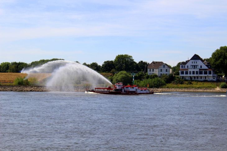 Jetzt war es genau anders herum. Von der Bramme waren es noch etliche Meter, bis ich den Rhein erreicht habe und an dieser Stelle fiel der niedrige Rheinpegel durch die Abzweigungen in Ruhr und Ruhrorter Hafen noch nicht einmal so auf. Die Feuerwehr übte unterdessen das Löschen am westlichen Rheinufer.