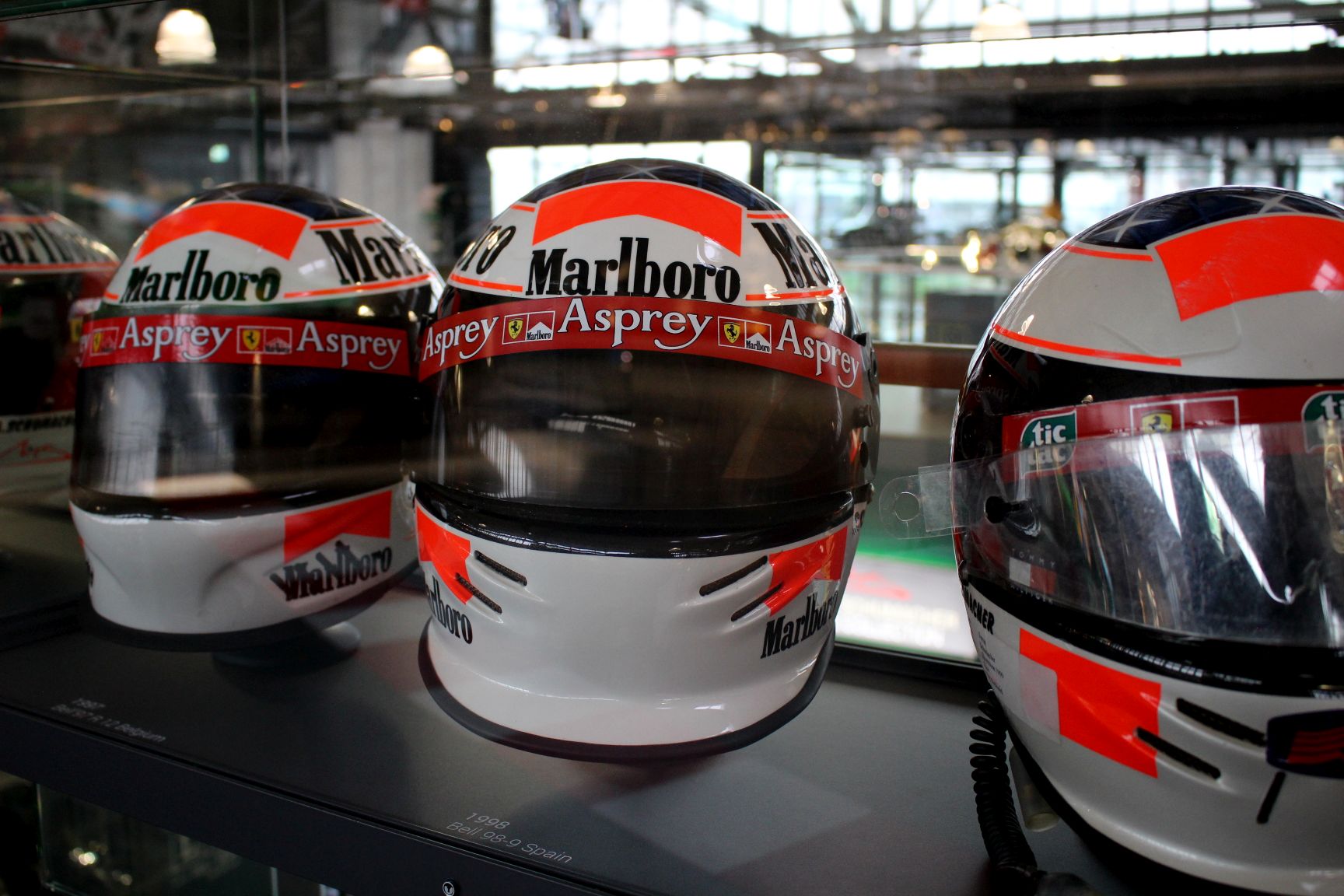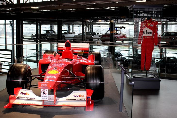 Die Michael Schumacher Sammlung zeigt ein knappes Dutzend Original Formel 1 Fahrzeuge, die Michael in seiner Zeit als Formel 1 Pilot gefahren hat. Dazu eine Auswahl an Overalls, Helmen, Caps und natürlich F1 Preise aus aller Welt. Alles entweder komplett hinter Glas oder zumindest mit Glasrahmen um die Autos, alarmgesichert versteht sich. Manche Glasumrandung ist da so empfindlich, daß auch schon mal eine unabsichtliche Berührung einen Alarm auslöst.