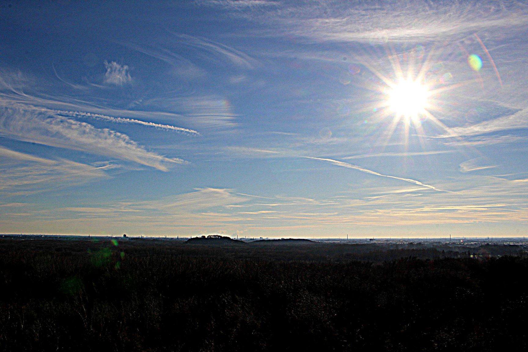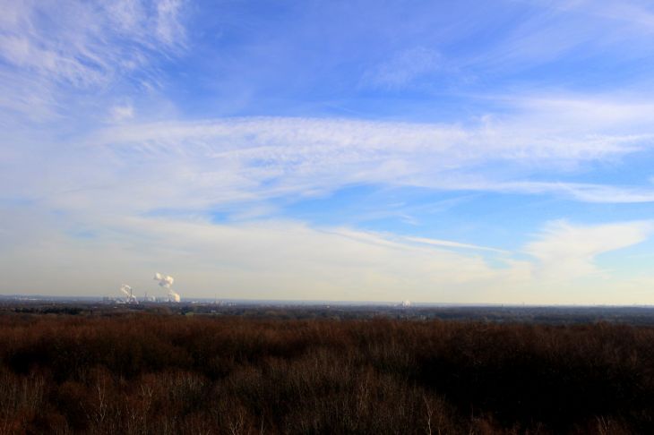 Beim Blick in Richtung Norden erkennt man den Turm der Zeche Friedrich Heinrich (Bergwerk West) in Kamp-Lintfort, nordöstlich das Steinkohlekraftwerk in Duisburg Walsum und weiter östlich über den Rhein den Flughafen und die Silhouette von Düsseldorf mit dem unverkennbaren Rheinturm. Danach folgt viel grün, viele Windräder und irgendwann der Förderturm der ehemaligen Zeche Tönisberg in Kempen.