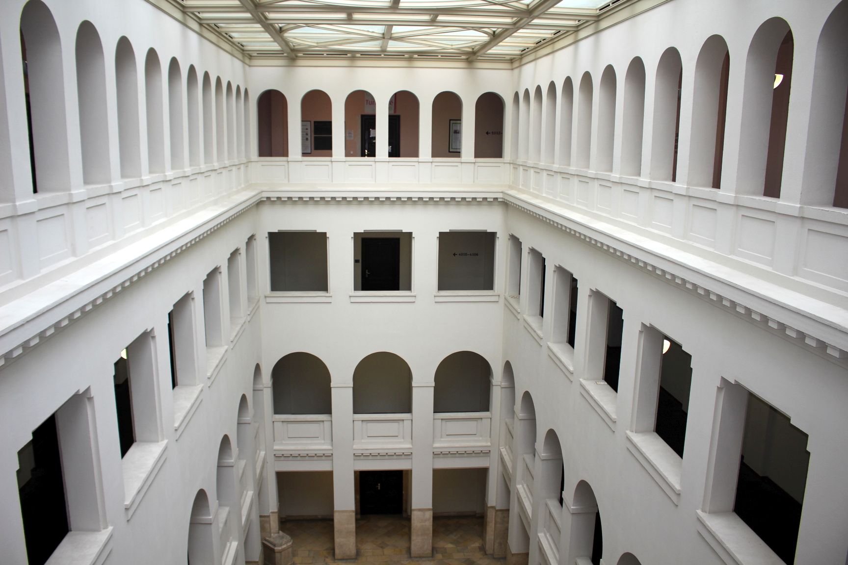 Der alte Materialaufzug (faßt bis zu 6000 kg 🙂 ) setzt sich in Bewegung und bringt mich in die 5. Etage des Gebäudes an der Essener Straße 80. Peter Behrens, wer war das eigentlich? Die Infotafel am Eingang der Ausstellung sagt er war ein Univeralkünstler. Er war Architekt, aber auch Maler, Schriftgestalter und Pionier modernen Industriedesigns. Manch ein Muster fand sich zunächst auf dem Boden (Fliesen) oder an der Wand (Tapeten), später aber auch an Möbeln oder Hausfassaden.
