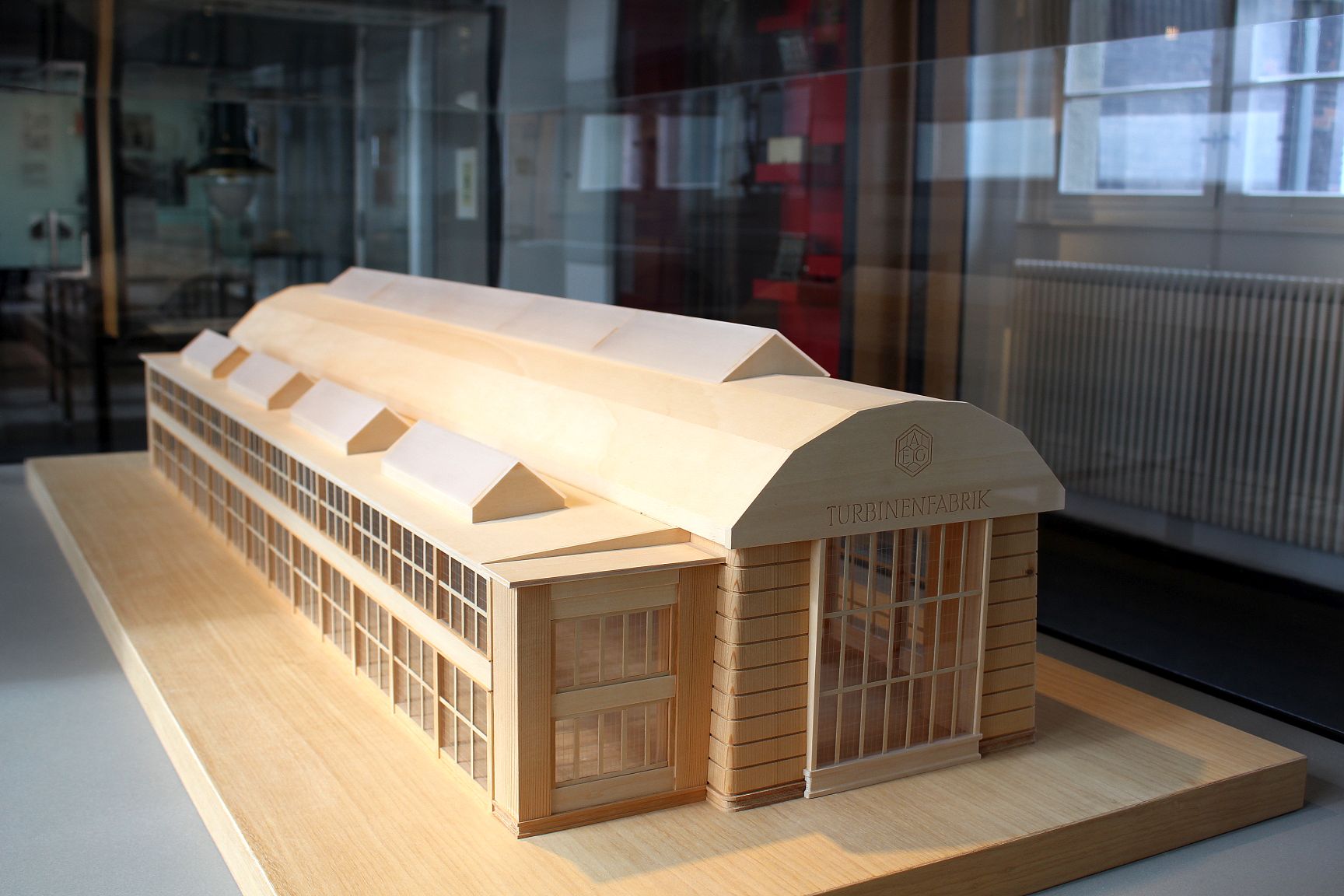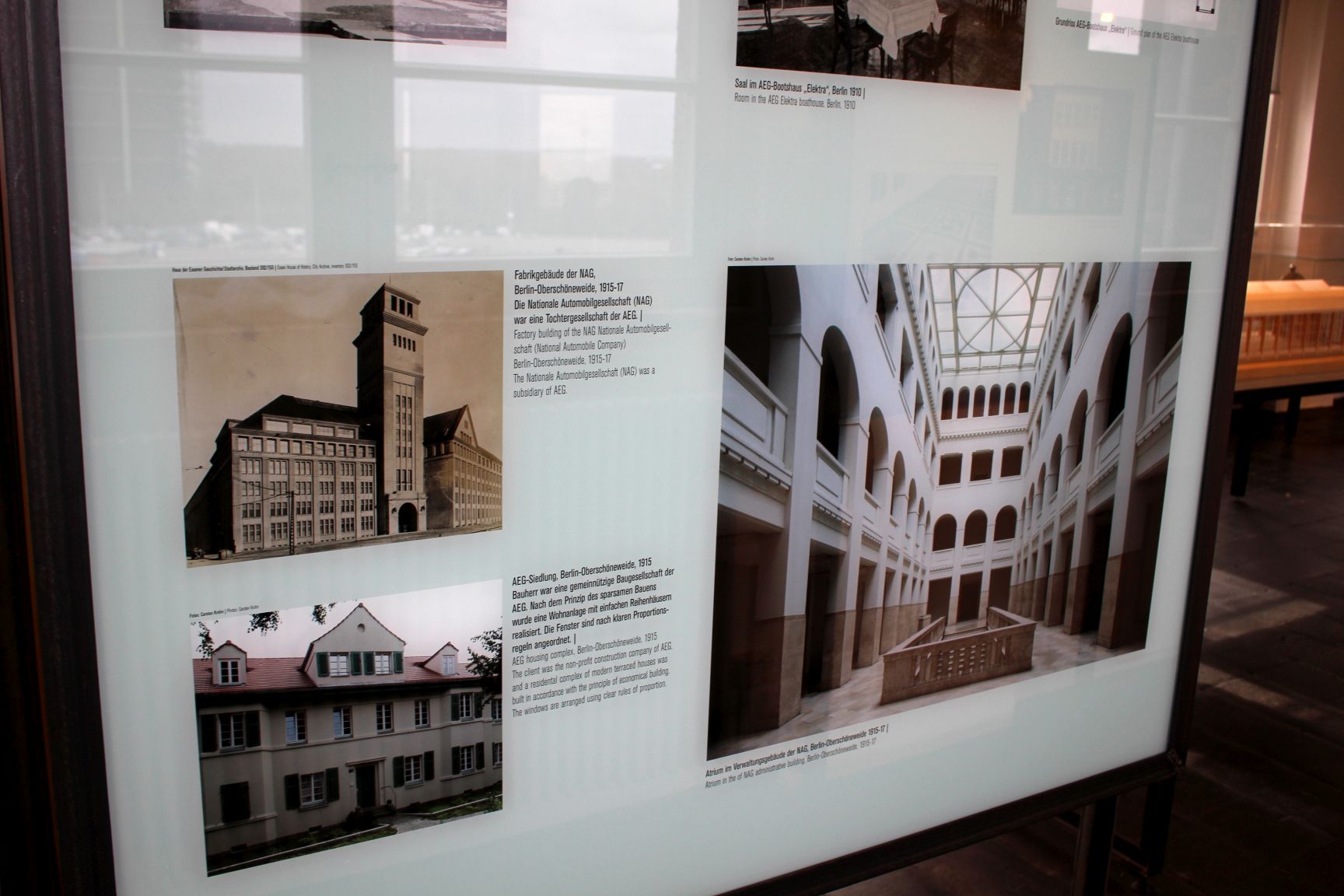 Und wieder ist AEG das Stichwort, denn für die AEG-Turbinenhalle in Berlin oder das Mannesmannhaus in Düsseldorf (bis 1953 Sitz der Staatskanzlei) steht ebenfalls der Name Peter Behrens. Zwei von vielen weiteren Gebäuden, die er entworfen hat und desssen kleine Nachbauten aus Holz die Ausstellung in Oberhausen begleiten. Daß meine Wahlheimat Krefeld schon vor über 100 Jahren Erwähnung fand, lese ich auf einer weiteren Tafel.