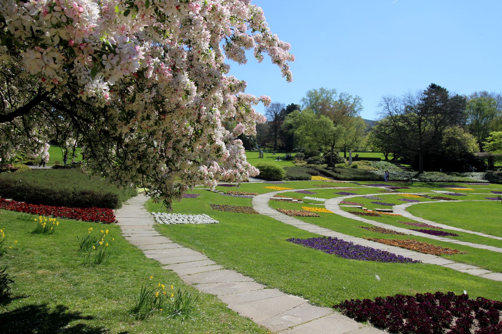 Karfreitag habe ich das wunderschöne Frühlingswetter genutzt und habe mir die Frühlingsbepflanzung des Parks angesehen. Gefühlt wird meine Tasche, die ich dabei habe, immer schwerer, denn mit im Gepäck hatte ich neben Getränken und Objektiven auch wieder die Glaskugel. Besonders schön ist dieses Jahr das Lindenrund geworden (1. Bild in diesem Beitrag). Hunderte von roten, rot/weißen und orangen Tulpen liegen der dort stehenden Speerwerferin zu Füßen.
