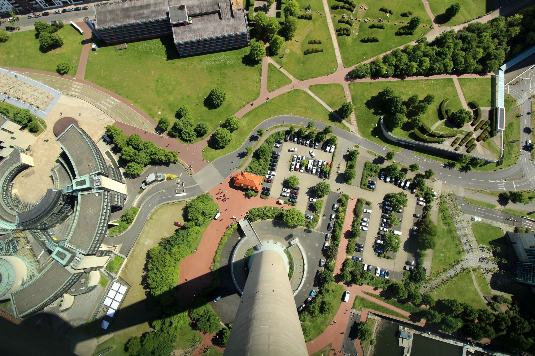 Die schrägen Fenster erlauben einen Blick auf den Fuß des Turms, vorausgesetzt ihr traut euch eine leichte Schräglage nach vorne einzunehmen. Wer vor 11.00 Uhr oder nach 22.00 Uhr kommt, zahlt übrigens nur 5,- €. Schaut sicherheitshalber vor dem Besuch mal auf www.rheinturm.de vorbei, denn es gibt Tage mit geschlossenen Veranstaltungen. Ich würde ja gerne mal ein Frühstück an der Casual Bar in luftiger Höhe verzehren. Weitere Bilder gibt’s bei Flickr und GooglePhotos.