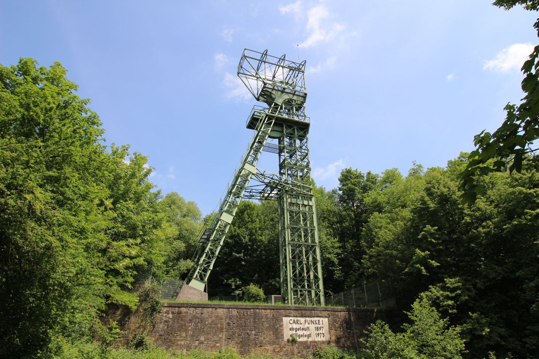 Als ich auf die eingangs erwähnte Wohnstraße fahre, erinnere ich mich, hier schon mal mit dem eigenen Auto auf der Suche nach der Zeche Carl Funke gewesen zu sein. Gleich links der Anleger „Heisingen“ der Weißen Flotte und 5-6 Fahrminuten später auch besagter Förderturm der ehemaligen Zeche. Rad- und Fußweg laufen parallel, aber schön getrennt, so daß man sich nicht in die Quere kommt. Für Autos ist hier am Förderturm generell Schluß. Jetzt ist es für Radfahrer nur noch ein Katzensprung.