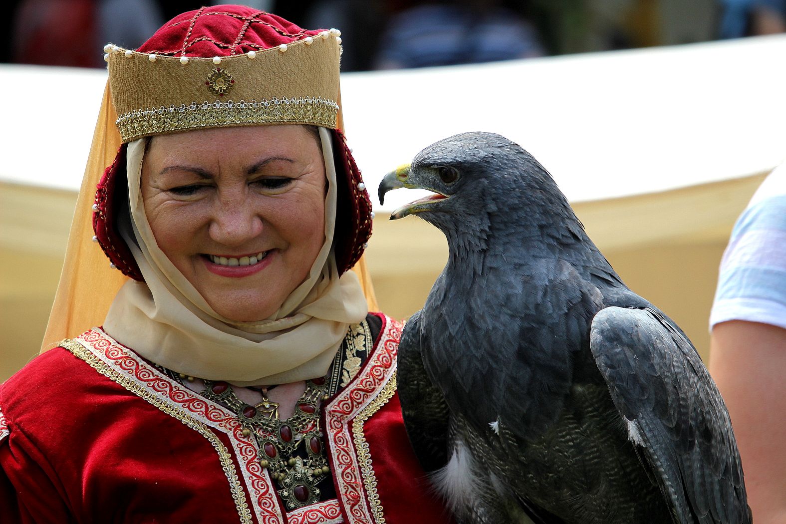 Ich wandte mich nun den verschiedenen Handwerkerständen zu und versuchte ein paar Schnappschüsse einzufangen, von Holzschnitzern und Seilmachern, von Bogenbauern und Kettenschmieden, von Kalligraphen und Korbflechtern, von Münzprägern und Seifenmachern. Zum Schluß verabschiedete ich mich mit einem Besuch bei der Falknerin von der Kulisse rund um Burg Linn. Was meint ihr, ob der Vogel auf dem Arm der Falknerin gerade einen Witz erzählte? 😉