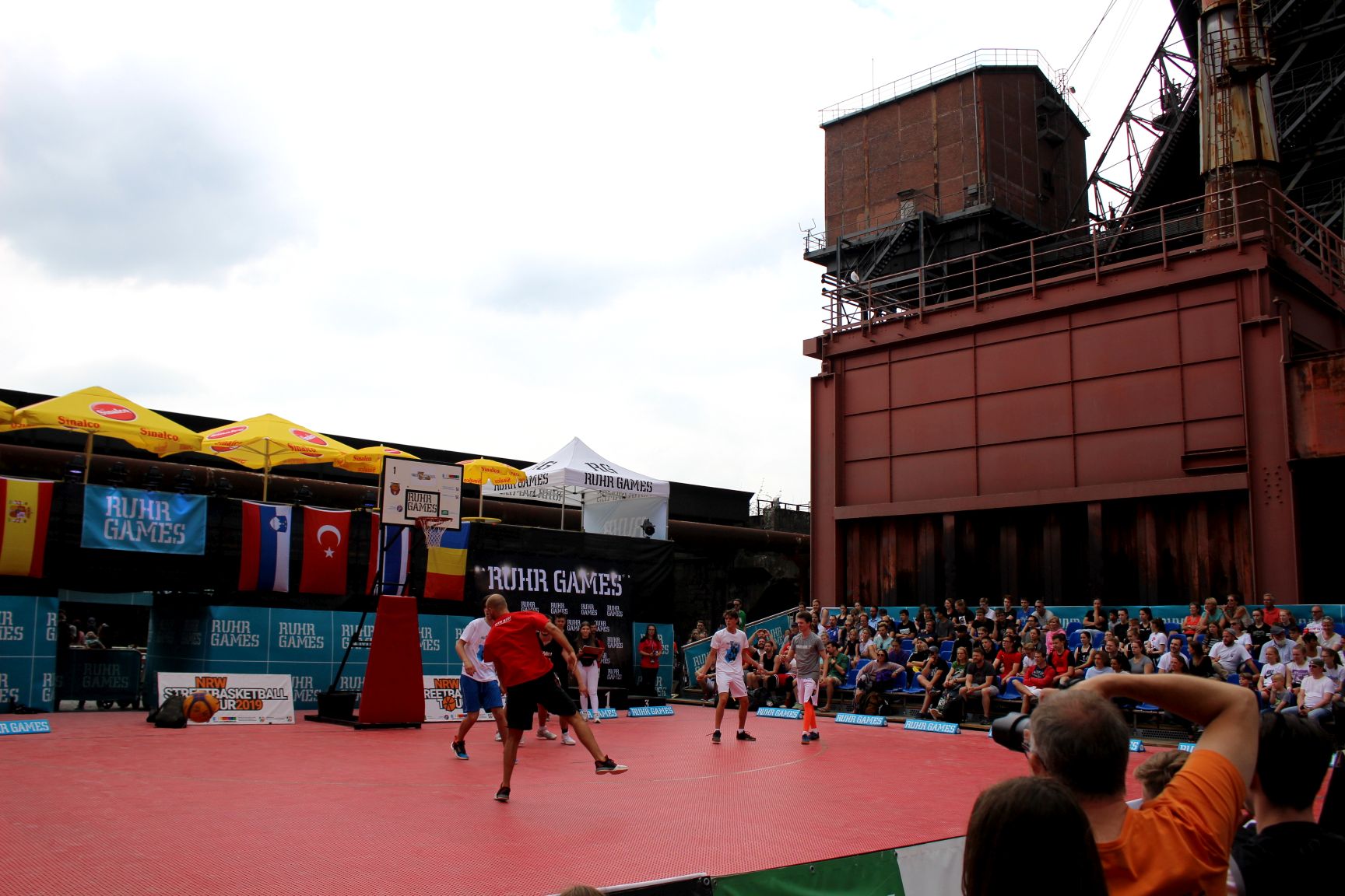 Leider sollte ich den abgelegenen Parkplatz noch büßen, dazu gleich mehr. Der Landschaftspark bietet mit seinen weiten Flächen und verschiedenen Hallen genügend Platz, sowohl für Sportarten die draußen, aber auch für Sportarten die drinnen stattfanden. Am ersten Tag war der Himmel noch etwas bedeckt, aber dennoch fanden sich bereits gegen Mittag die erste Besucher ein. Mein erster Weg führte mich am Basketball vorbei.