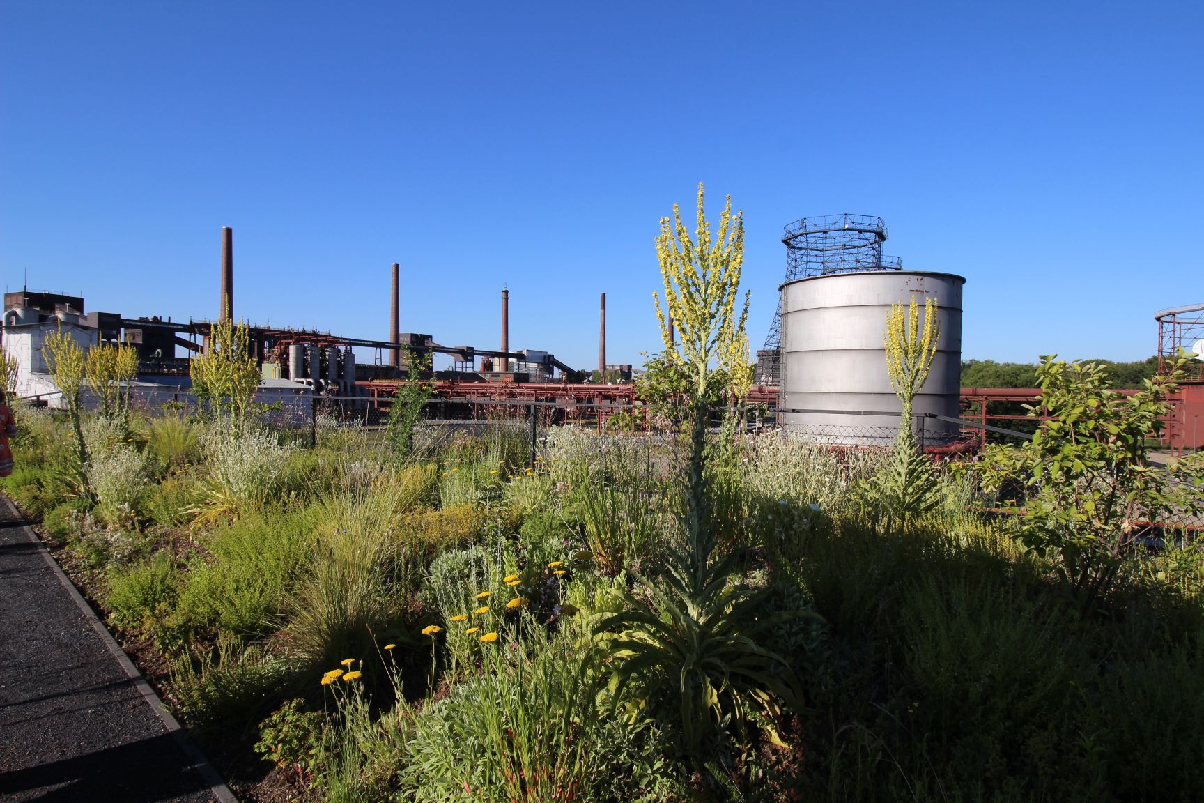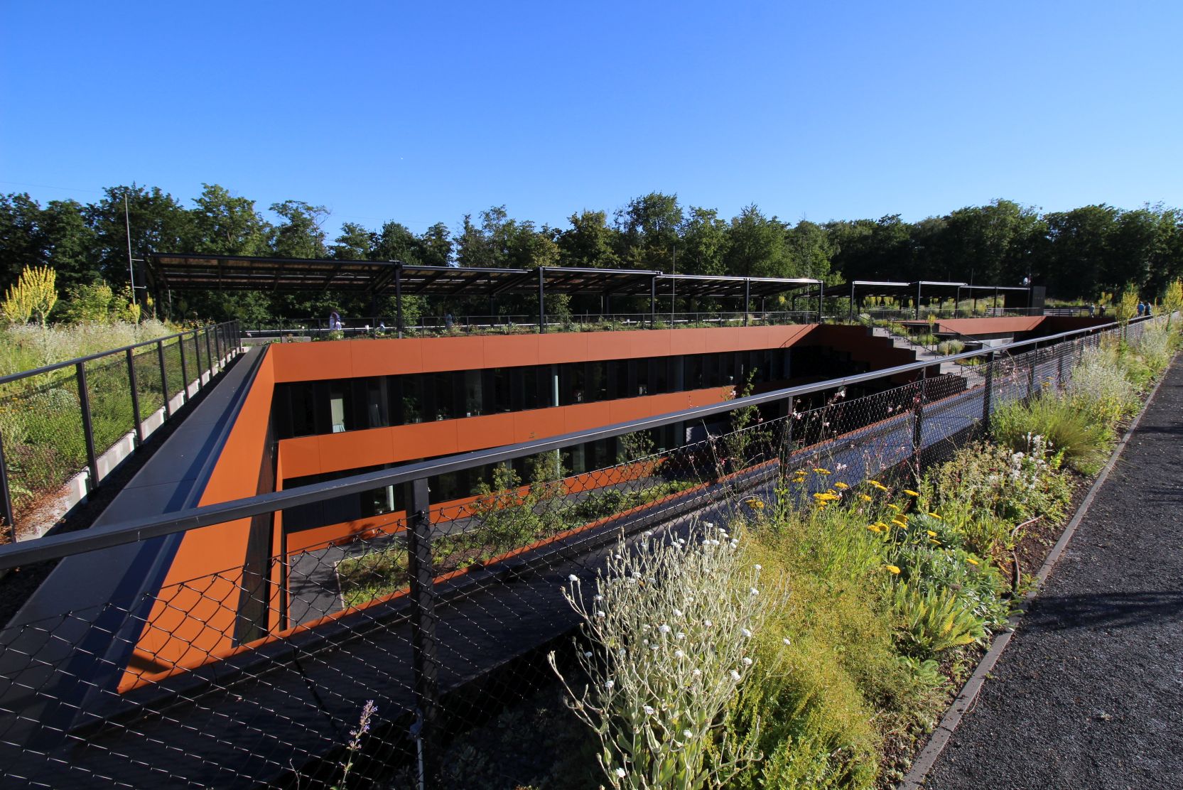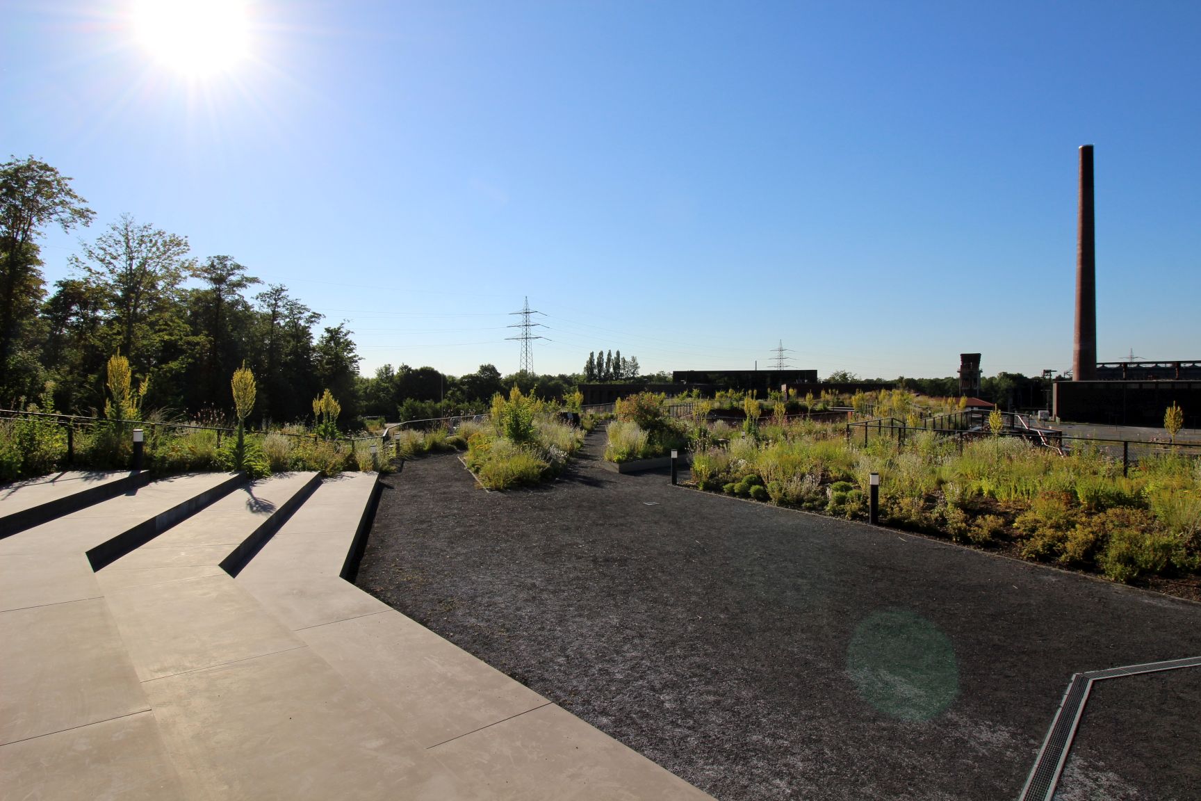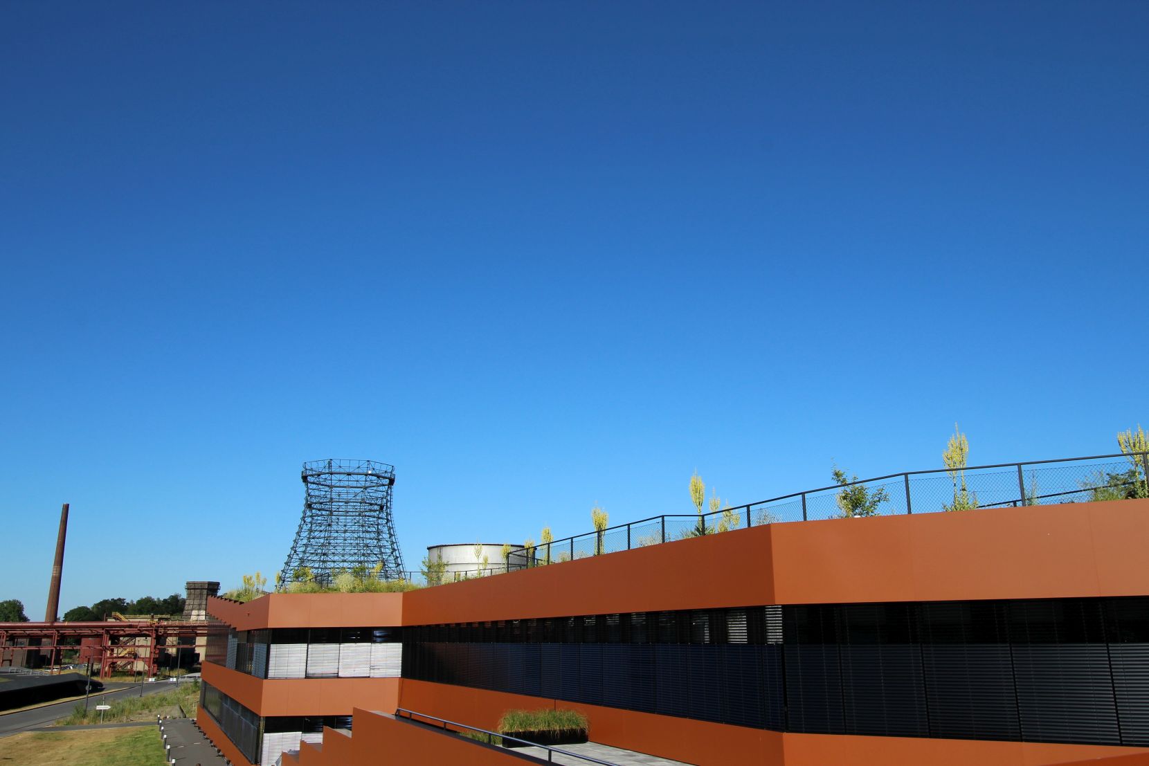 Weil ich in den letzten Jahren die Kokerei oft sträflich vernachlässigt hatte, führte mich mein Weg in diesem Jahr als erstes dorthin. Besucher durften eine Führung auf die Dachterrasse des neuen zweistöckigen RAG Gebäudes mitmachen. Sowas lasse ich mir nicht zweimal sagen. Das Gebäude wurde nachhaltig und Ressourcen schonend gebaut. Die Materialien sind später einmal wiederverwertbar. Zusätzlich ist das Dach mit rd. 30 cm Erde gefüllt und begrünt. Eine Photovoltaikpergola sorgt für Schatten und gleichzeitig für Strom.